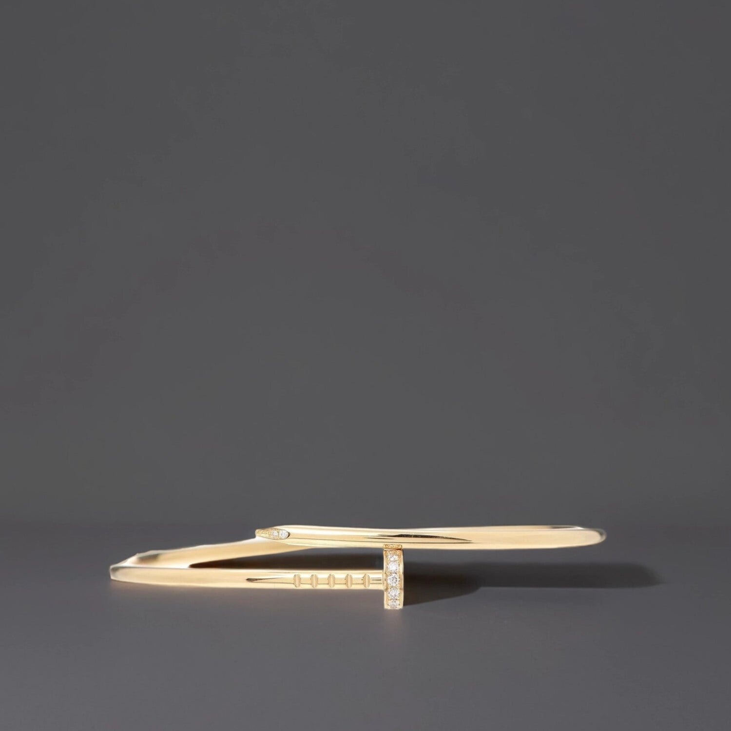This is an authentic CARTIER 18K Yellow Gold Diamond Small Juste Un Clou Bracelet 17. The bracelet is crafted of 18 karat yellow gold and features a flexible nail motif bangle set with round brilliant cut diamonds, approximately .18 total carat weight.