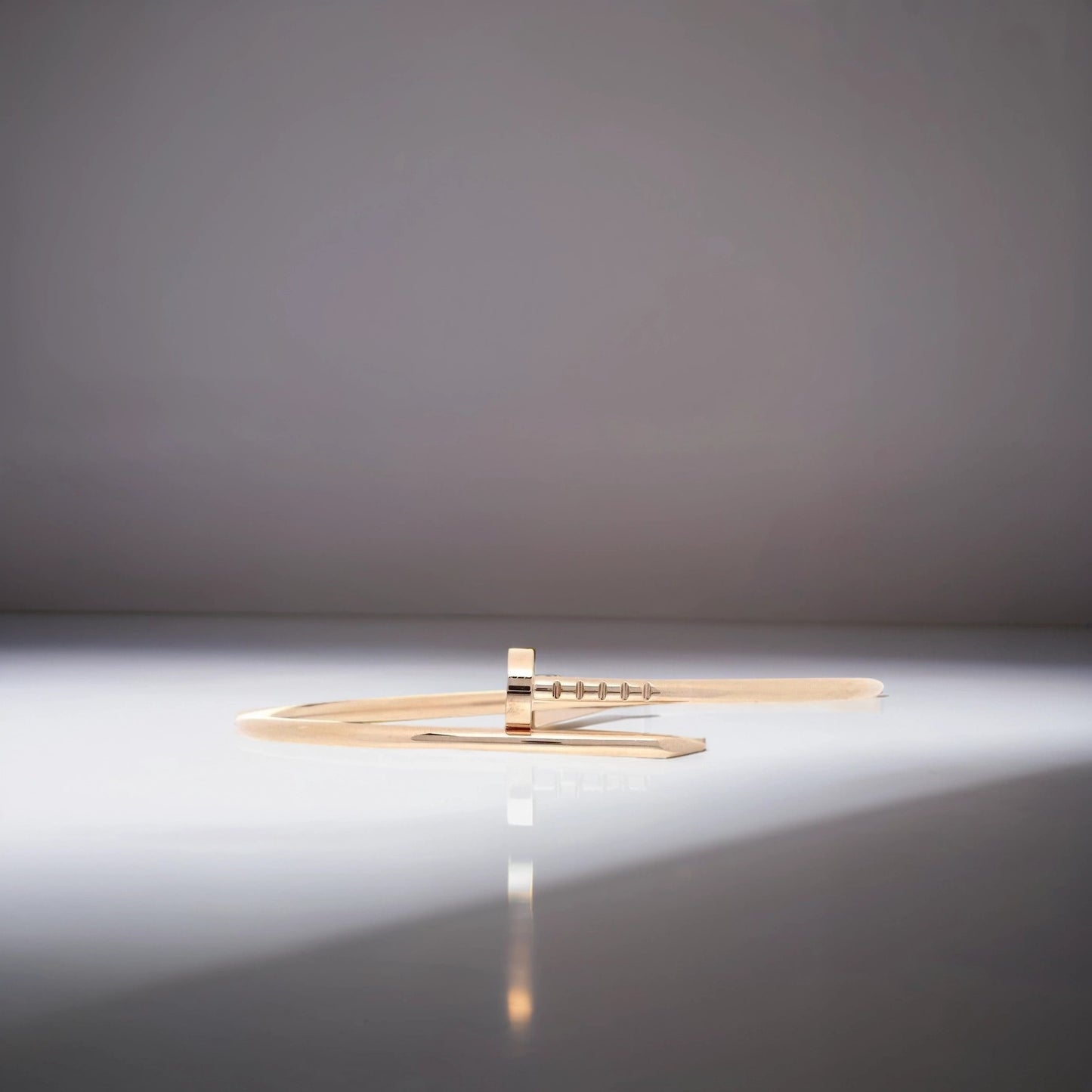 This is an authentic CARTIER 18K Yellow Gold Small Juste Un Clou Bracelet 17. The bracelet is crafted of 18 karat yellow gold and features a nail motif along a flexible band.