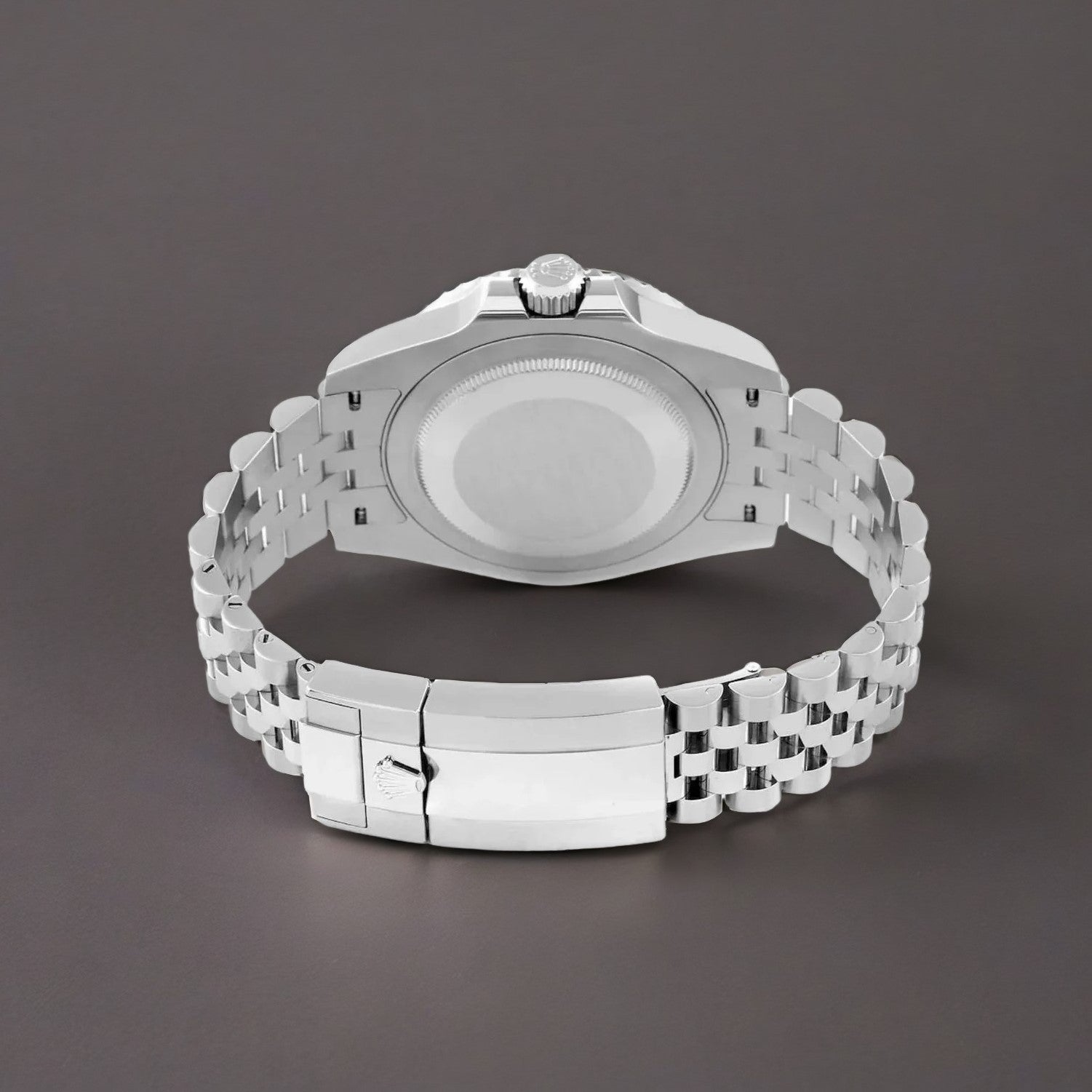 Rolex GMT Master II Blue Red Pepsi Bezel Steel Mens Watch . automatic self-winding movement. Stainless steel case 40 mm in diameter. Rolex logo on the crown. Stainless steel bidirectional rotating bezel with blue and red 24-hour ceramic bezel insert. Scratch resistant sapphire crystal with cyclops magnifier. Black lacquer dial with white luminescent hour markers and Mercedes hands. Red GMT hand. Date window at 3 o'clock aperture. Stainless steel jubilee bracelet with flip lock clasp and easylink micro-adjustment.
