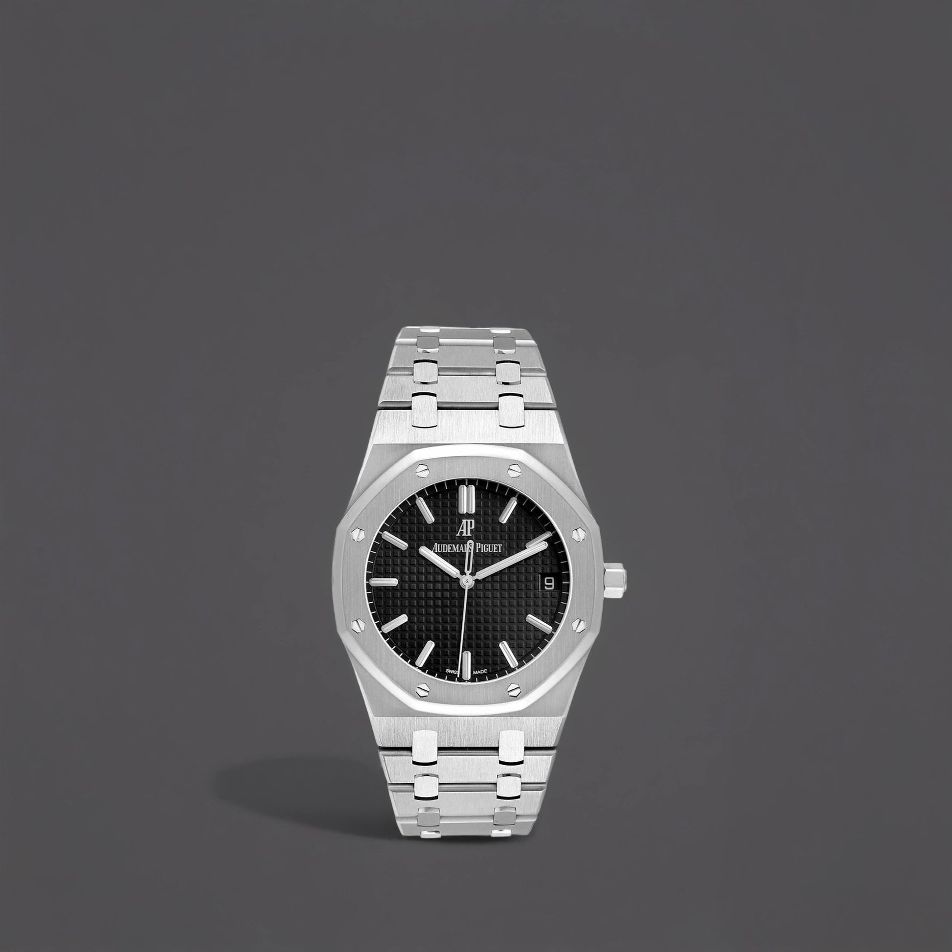Audemars Piguet Royal Oak Black Dial Steel Mens Watch. Automatic self-winding movement with a 70-hour power reserve. Stainless steel octagonal case 41.0 mm in diameter. Transparent exhibition sapphire crystal caseback. AP logo on the screw-down octagonal crown. Stainless steel bezel punctuated with 8 signature screws. Scratch resistant sapphire crystal. Black dial with "Grande Tapisserie" (waffle pattern) with luminescent raised baton hour markers and hands. Sweeping second hand. Date window at 3 o'clock position. Outer stick minute markers. Stainless steel bracelet with a double deployant clasp.