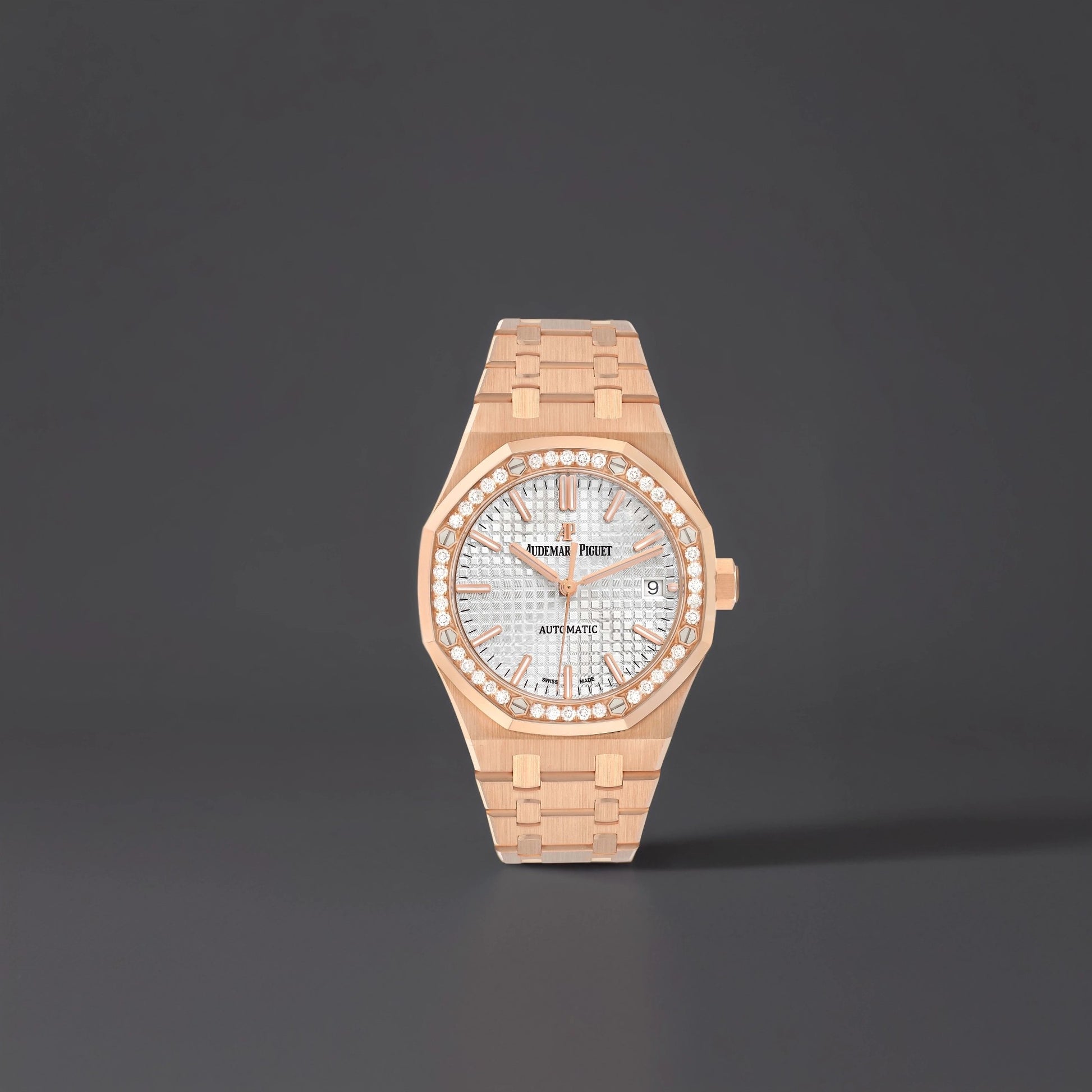 Audemars Piguet Royal Oak Rose Gold Silver Dial Watch. Automatic self-winding movement. 18k rose gold octagonal case 37.0 mm in diameter. Glareproofed sapphire crystal and caseback. Audemars Piguet logo on the 18k rose gold octagonal crown. 18k rose gold bezel and original Audemars Piguet factory diamond-set bezel punctuated with 8 signature screws. Scratch resistant sapphire crystal. Silver dial with “Grande Tapisserie” pattern, rose gold applied hour-markers and Royal Oak hands with luminescent coating. Sweeping central second hand. Date window at the 3 o'clock aperature. 18k rose gold bracelet with a double deployant clasp.