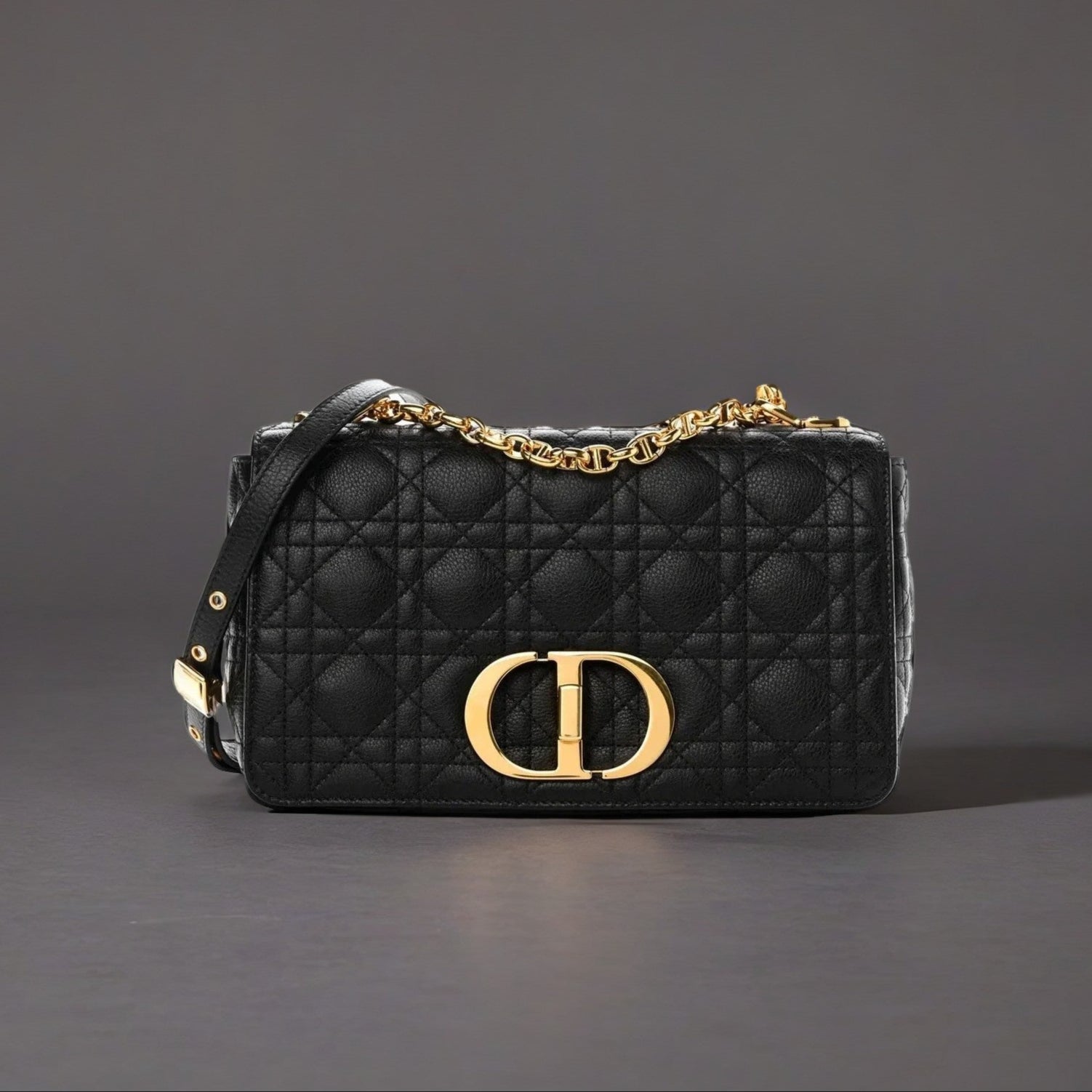 This is an authentic CHRISTIAN DIOR Calfskin Cannage Medium Caro Bag in Black. This flap bag is finely crafted in black. The bag features a gold chain and leather shoulder strap, a rear pocket, and a gold turn lock. This opens to a black leather interior with zipper and patch pockets.