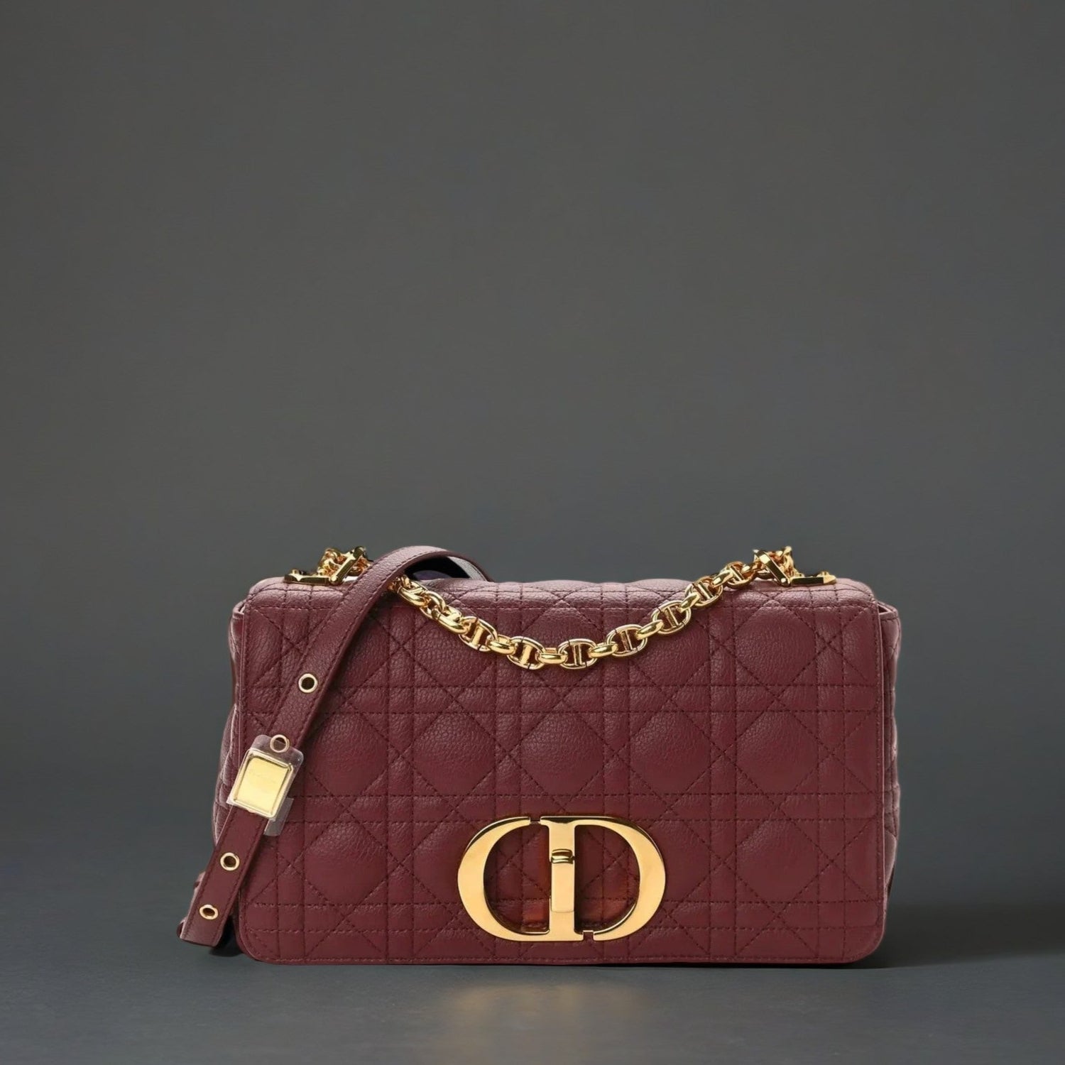 This is an authentic CHRISTIAN DIOR Calfskin Cannage Medium Caro Bag in Brick Red. This flap bag is finely crafted in a dark red colored lambskin leather. The bag features an adjustable belt strap and polished gold hardware with a crossover flap that open to a matching smooth leather interior with zipper and patch pockets.