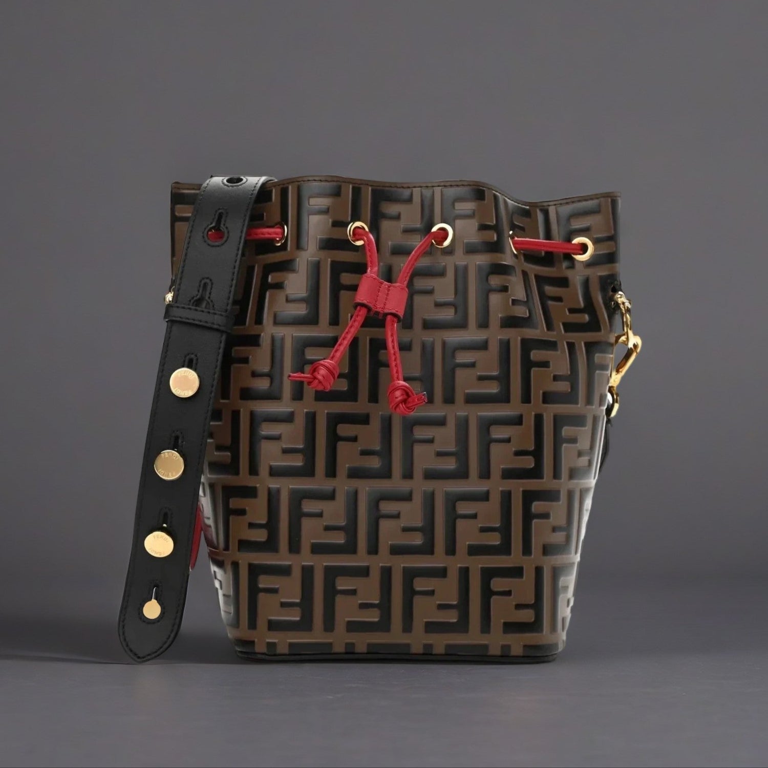 Calfskin F is Fendi FF 1974 Embossed Grande Mon Tresor Bucket Bag Maya Black Fragola