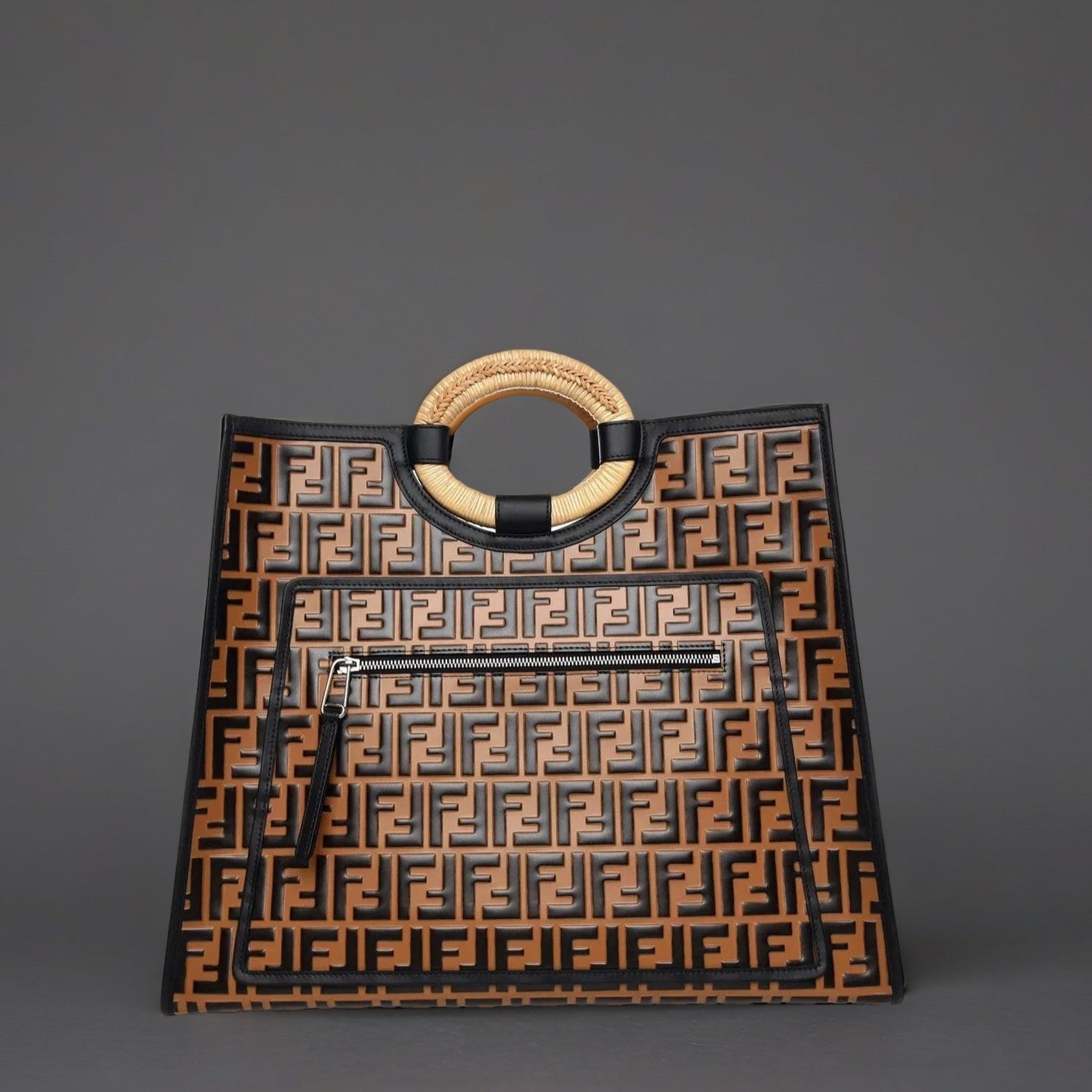 Calfskin FF Embossed Large Runaway Shopper Tote Tobacco Black