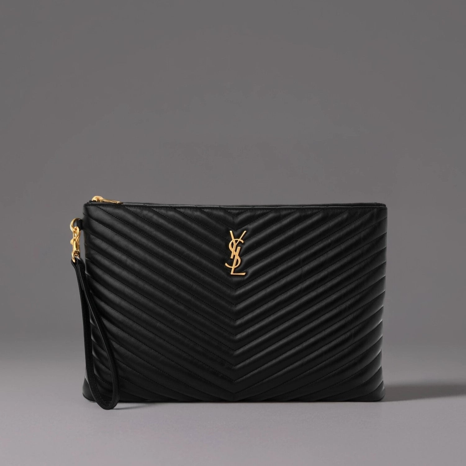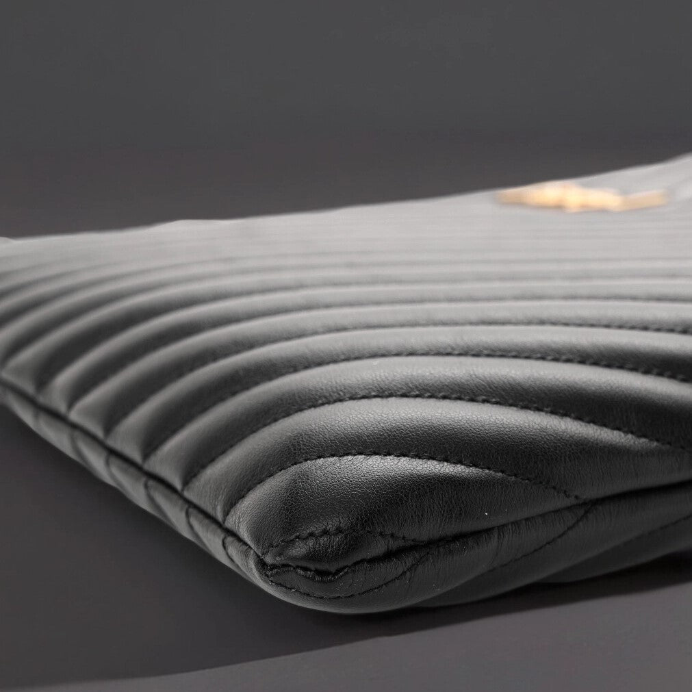 This is an authentic SAINT LAURENT Calfskin Matelasse Chevron Monogram Document Holder in Black. This fabulous document holder is crafted of chevron quilted calfskin leather in black. It features a prominent gold YSL logo at the center. The top zipper opens to a black fabric interior with card slots and patch pockets.