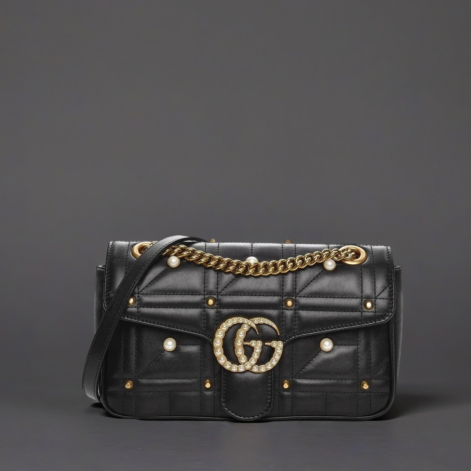 We guarantee this is an authentic GUCCI Calfskin Matelasse Studded Small Pearly GG Marmont Shoulder Bag Black. This handbag is made out of soft calfskin leather in black. This bag features an aged gold chain shoulder strap, pearl and gold studs, and interlocking pearl lined GG logo closure. The front flap opens to a beige fabric interior with a zipper pockket. This is the perfect everyday shoulder bag, from Gucci.
