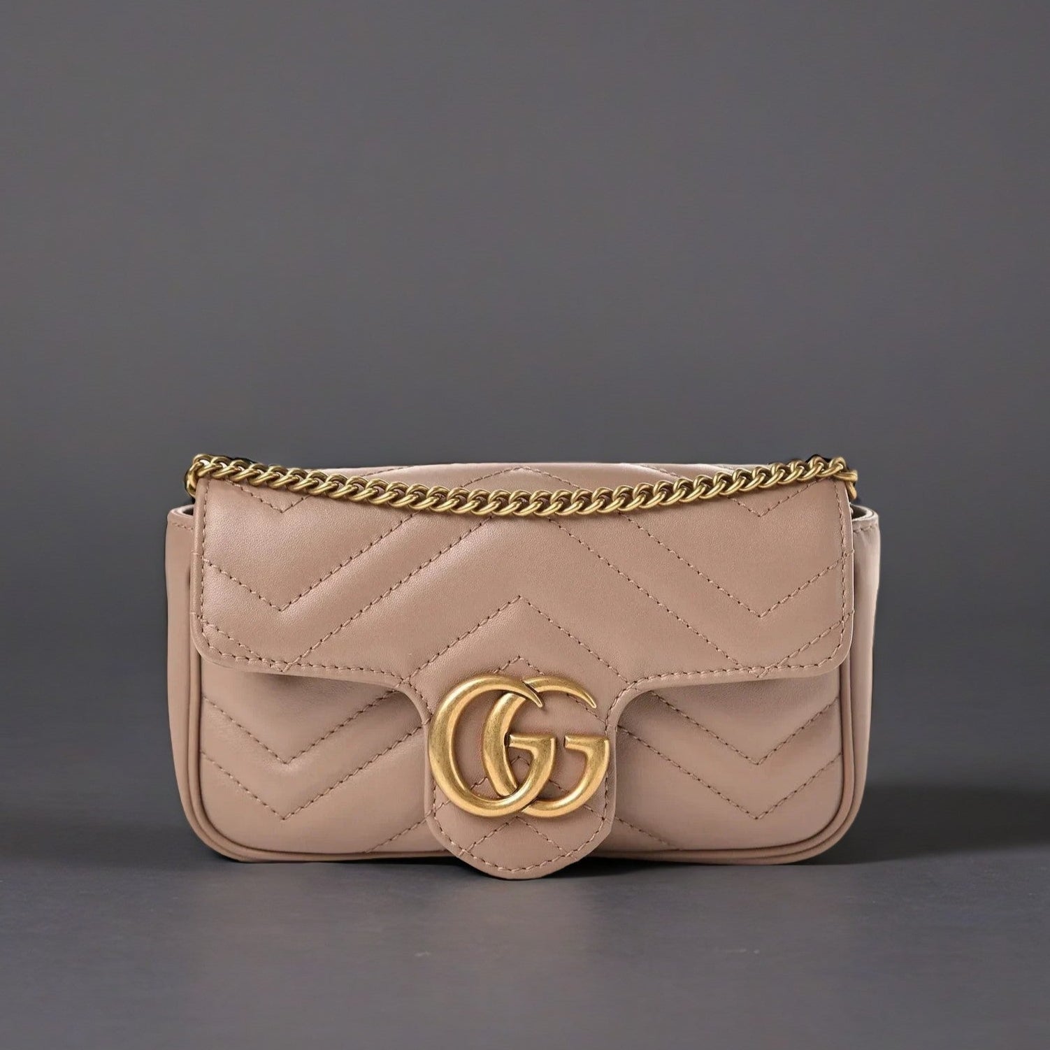This is an authentic GUCCI Calfskin Matelasse Super Mini GG Marmont in Nude. This shoulder bag is crafted of smooth and supple dark beige calfskin leather. This cross body bag features a long aged gold chain shoulder strap. The front crossover flap features an interlocking aged gold GG logo that opens to a light beige interior with a key chain. This compact, yet spacious shoulder bag is perfect for anytime of the day, whether it be for casual or formal wear, from Gucci!