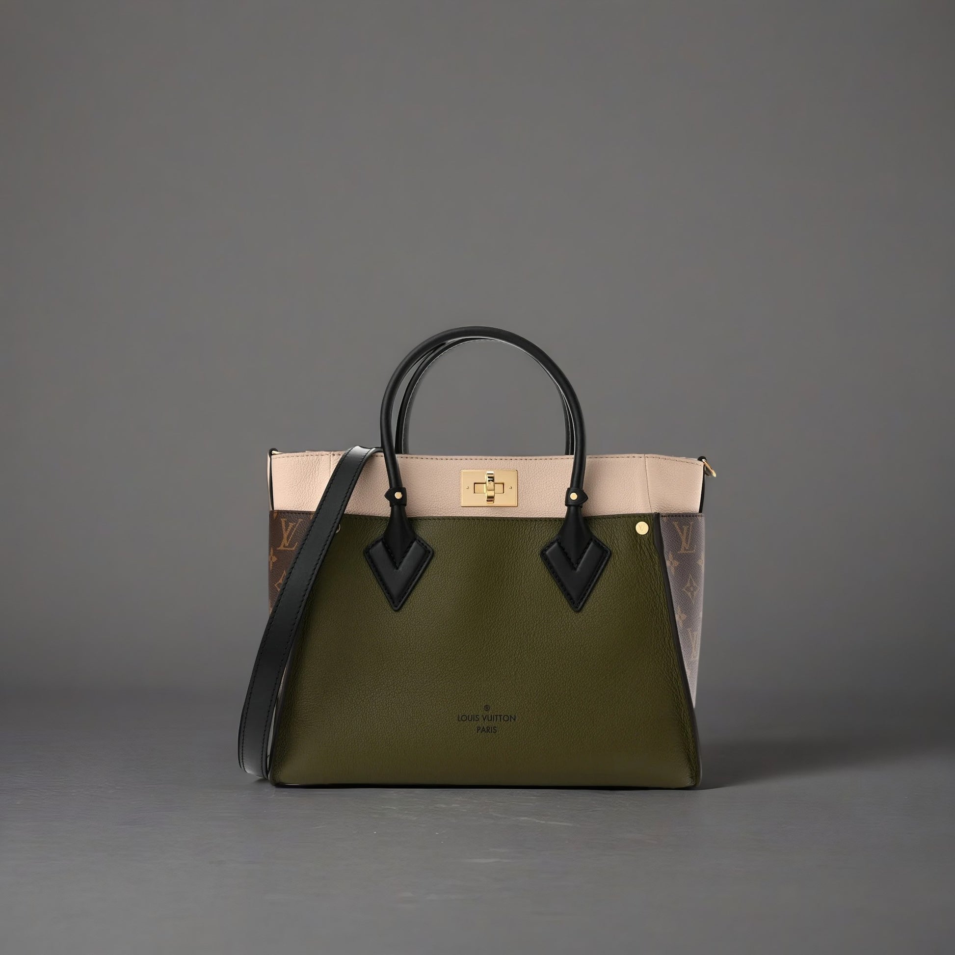 This is an authentic LOUIS VUITTON Calfskin Monogram On My Side Laurier. This tote is crafted of an elegant combination of grained calfskin leather in beige, olive green and monogram canvas. The shoulder bag features rolled black leather top handles with an optional shoulder strap, and large outside pockets in contrasting leather and canvas create a bag-in-a-bag look. The top opens to a matching microfiber interior with zipper and patch pockets.