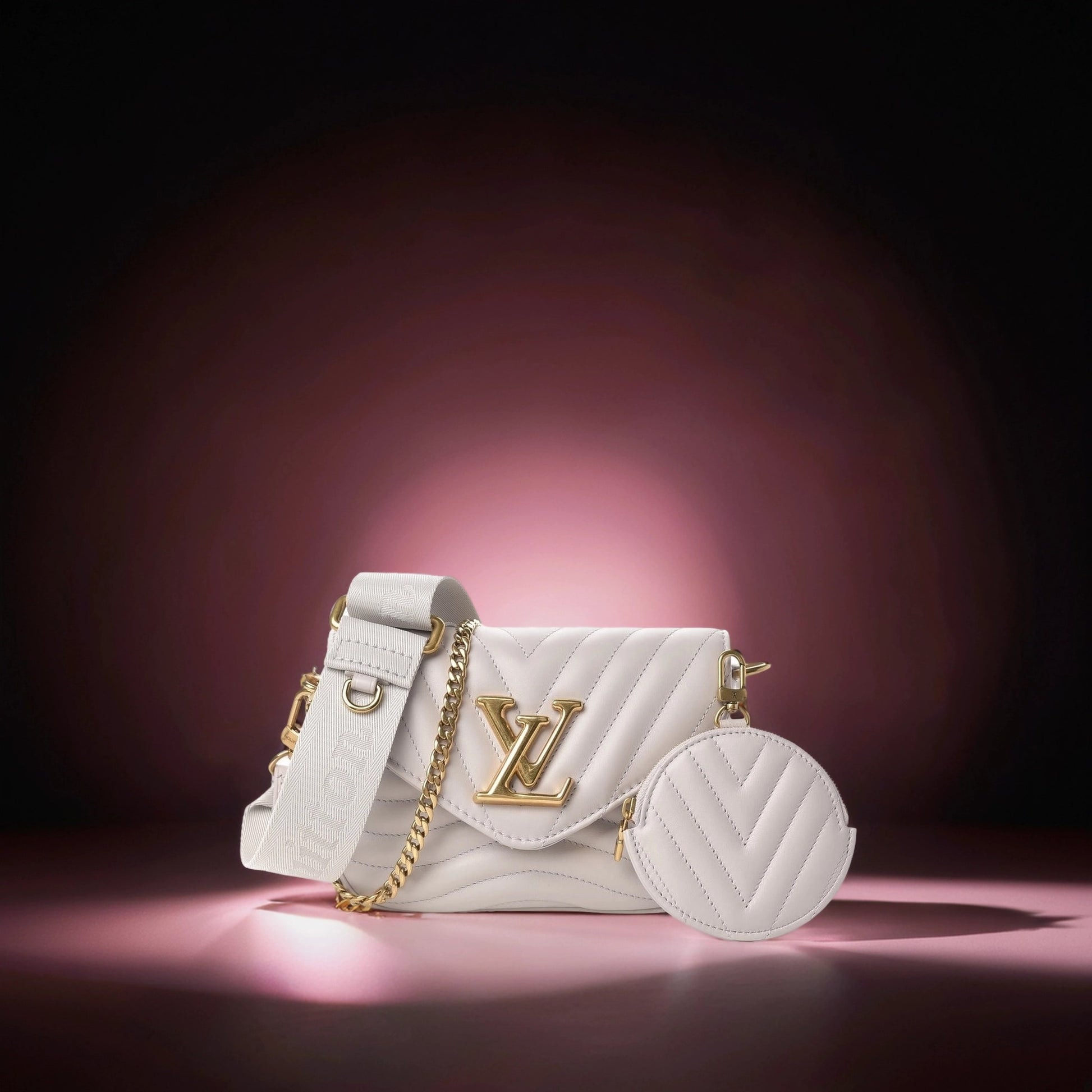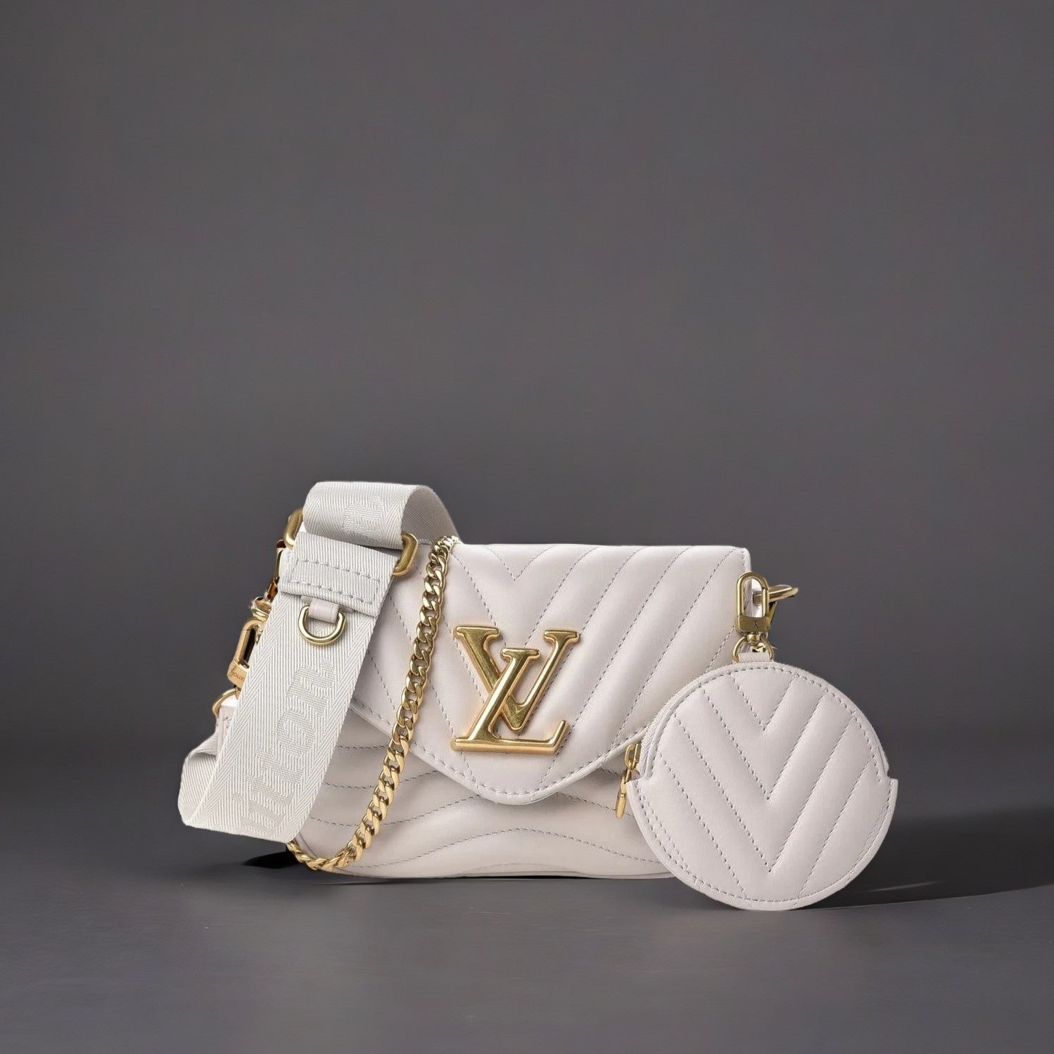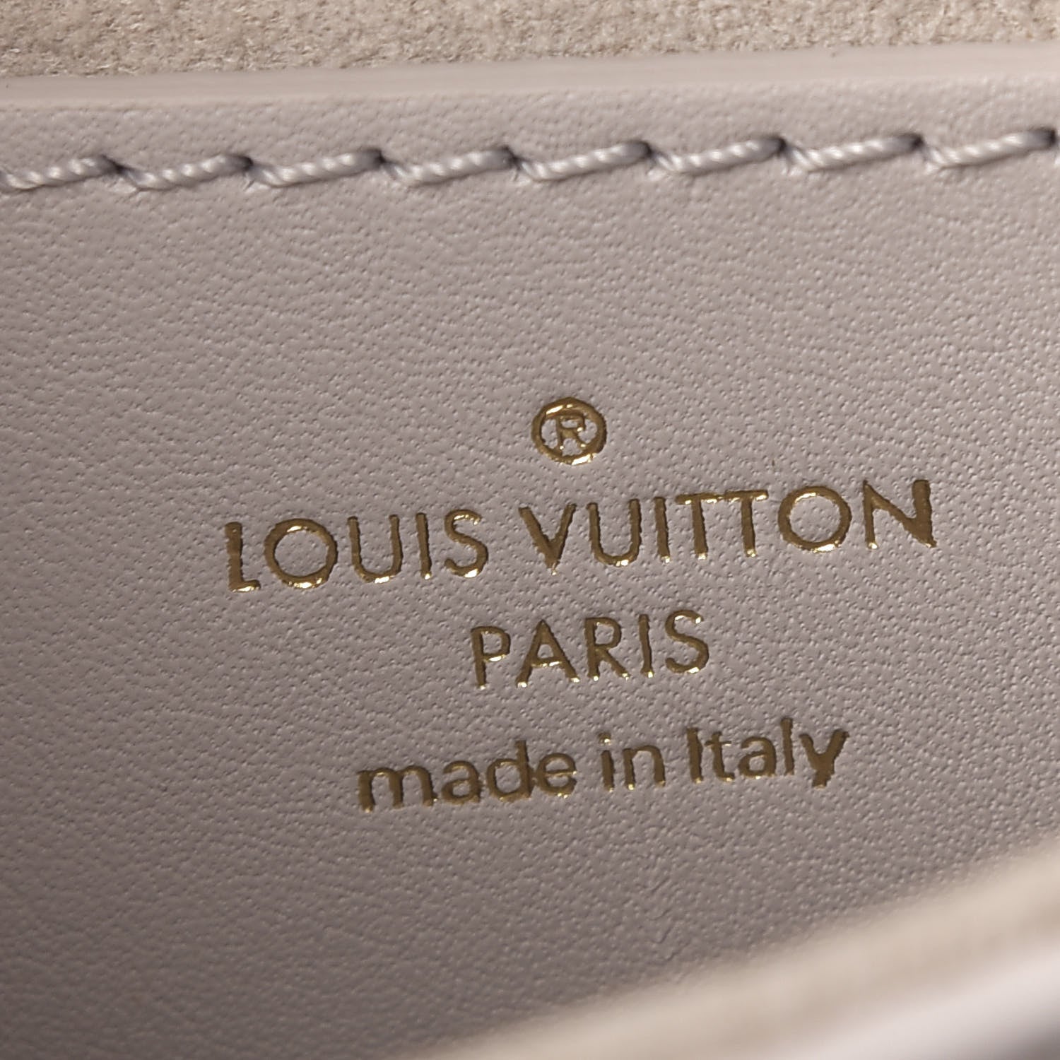 This is an authentic LOUIS VUITTON Calfskin New Wave Multi Pochettein Brume. This chic shoulder bag is crafted of quilted calfskin leather in light grey. The shoulder bag features a gold chain strap, an adjustable shoulder strap, and edgy hardware with an aged gold metal finish. The top flap opens to a light grey microfiber interior with a patch pocket. Enjoy this bag for day or evening use with the luxury and style of Louis Vuitton!