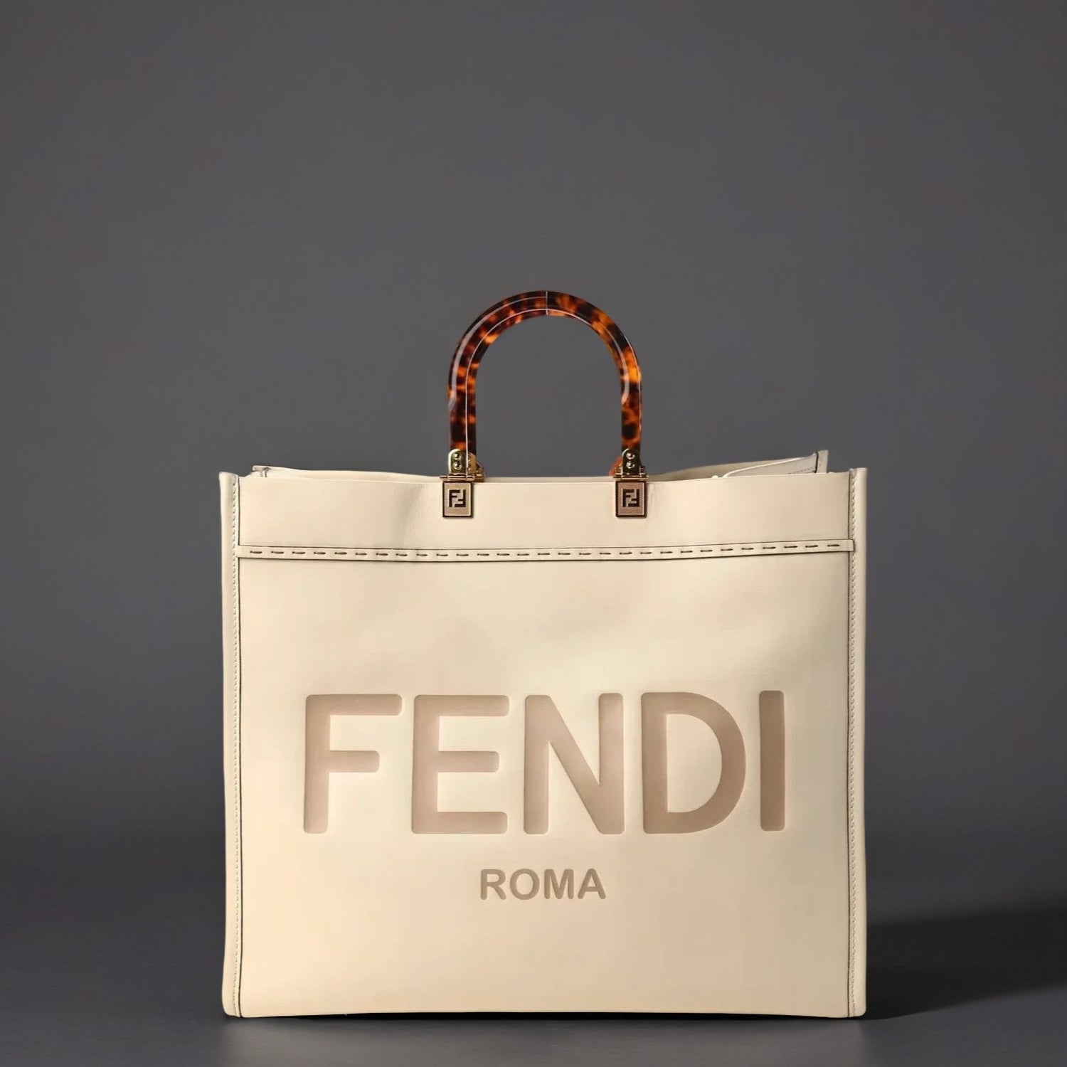 This is an authentic FENDI Calfskin Plexiglass Medium Sunshine Shopper Tote in White. This stylish shopping tote is crafted in cream leather with stitched detailing, and features resin tortoise shell top handles, gold hardware and a bold, embossed Fendi logo. The top opens to a spacious interior with a leather base.