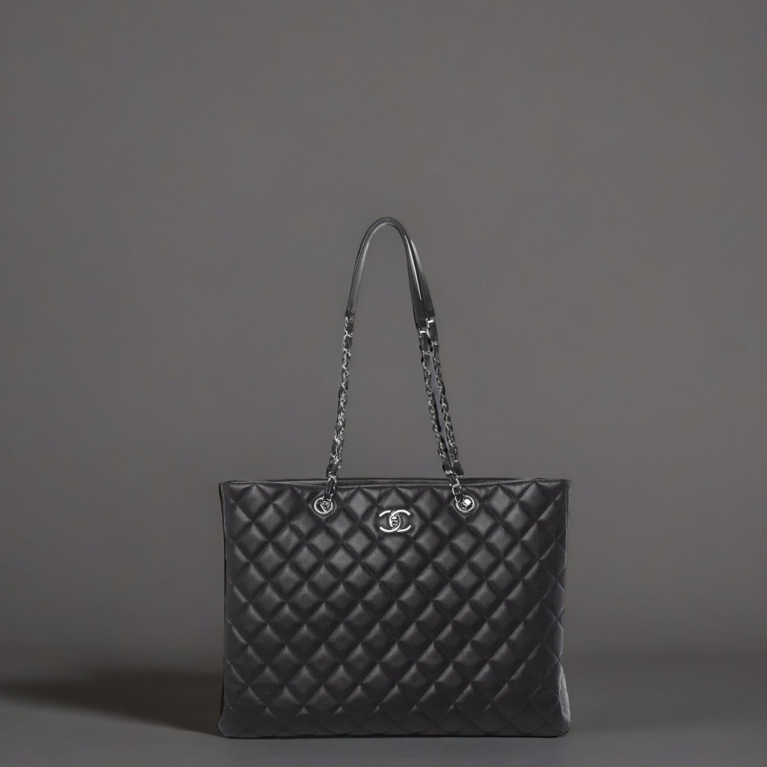 This is an authentic CHANEL Calfskin Quilted Large CC Shopping Tote in Black. This edgy newer style features luxurious calfskin leather in signature diamond shaped quilting in black. The shoulder straps are crafted of a prominent polished silver chain link threaded with leather and a leather shoulder pad. The top features an interior closure fold secured by a CC twist lock that opens to a black fabric interior with zipper and patch pockets.