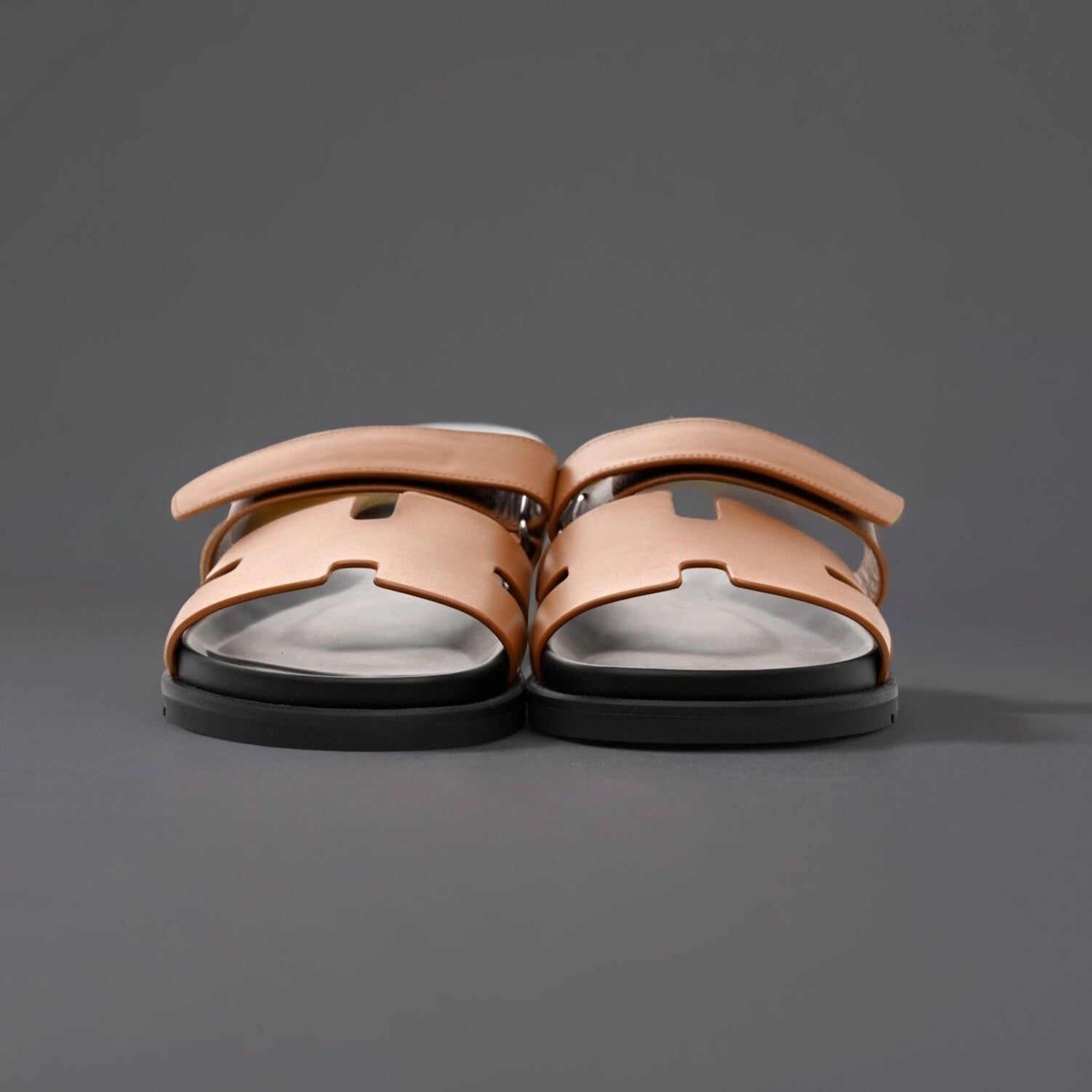 This is an authentic pair of HERMES Calfskin Womens Chypre Sandal size 40.5 in Gold. These stylish sandals are crafted of leather in golden brown and black. They feature a toe strap across-over large Hermes H and an adjustable strap.