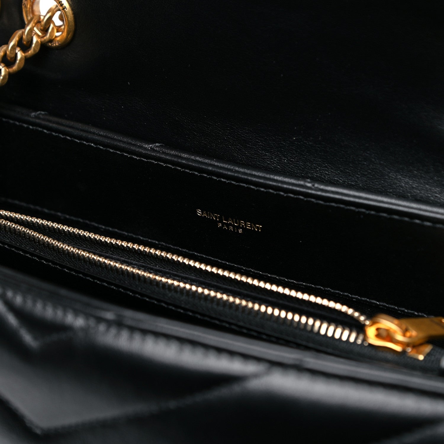 This is an authentic SAINT LAURENT Calfskin Y Quilted Monogram Medium Loulou Chain Satchel in Black. This shoulder bag features a chevron quilting in black. The bag features an aged gold chain-link shoulder strap with a matching leather shoulder pad. The front flap features a prominent aged gold YSL monogram detail and opens up to a partitioned black fabric interior with a zippered pocket.