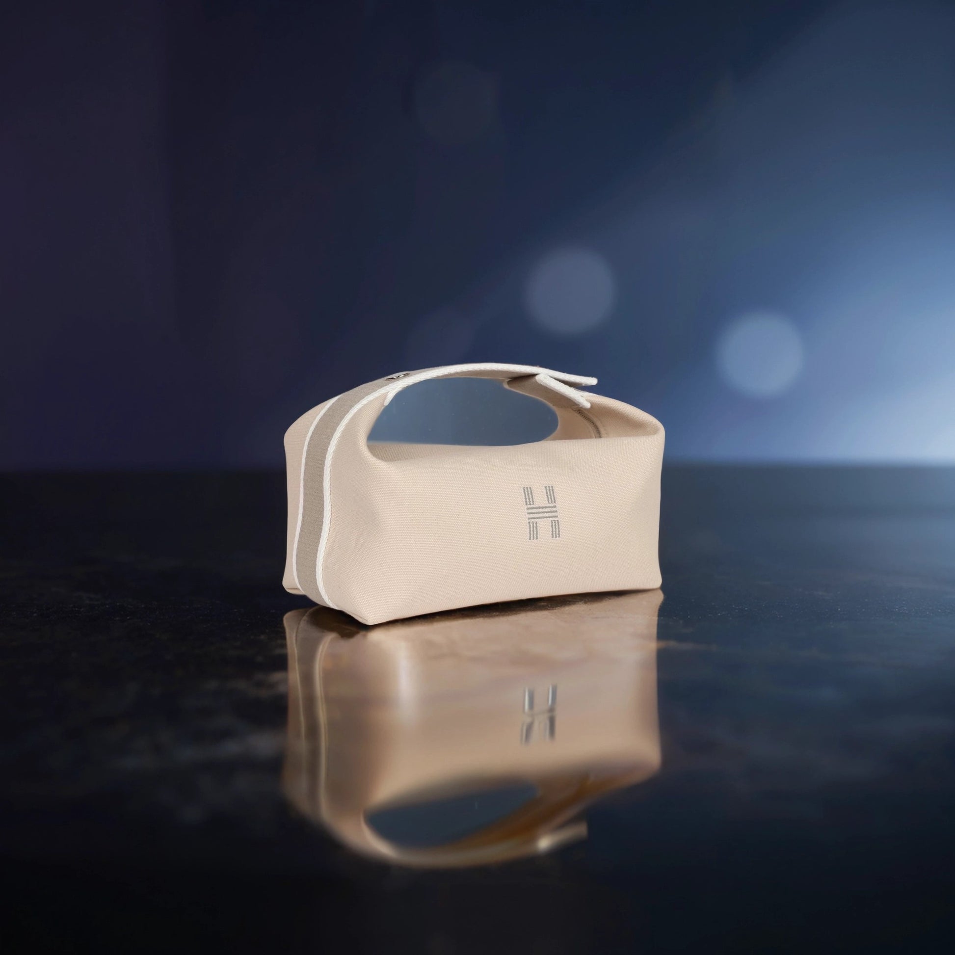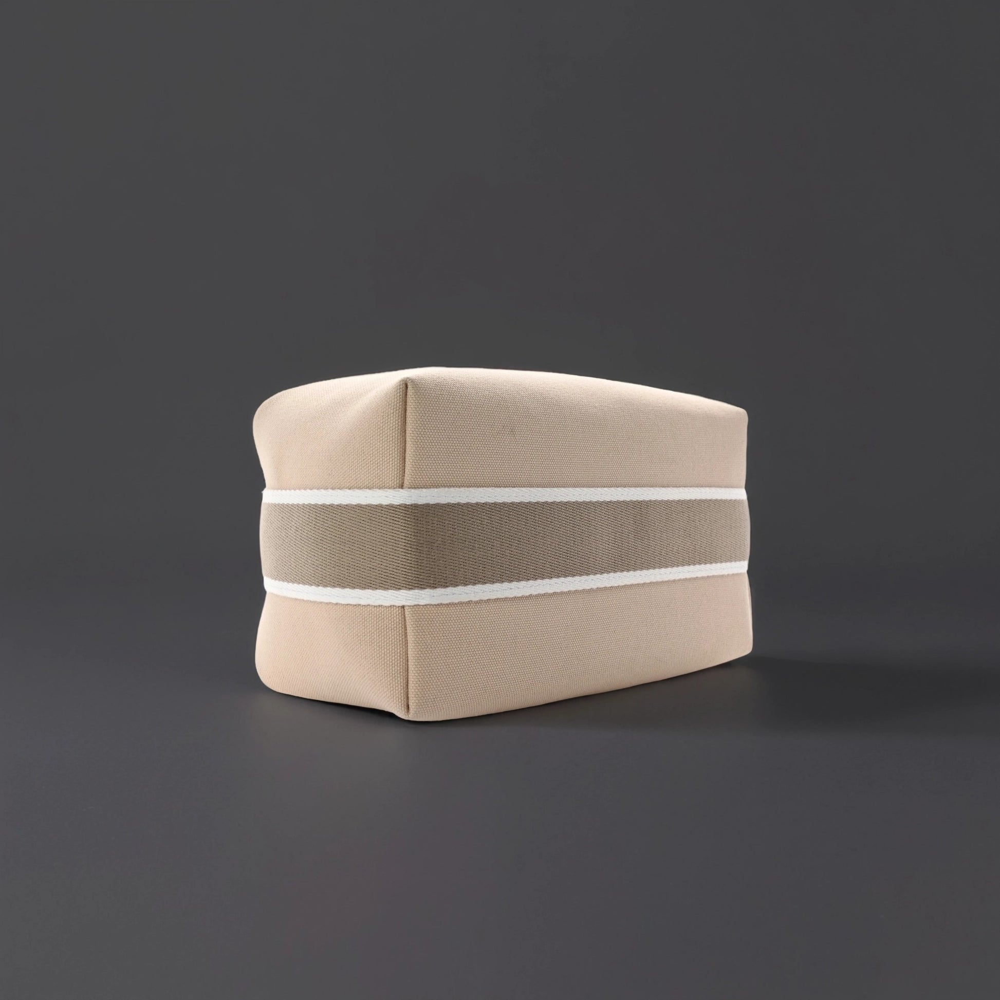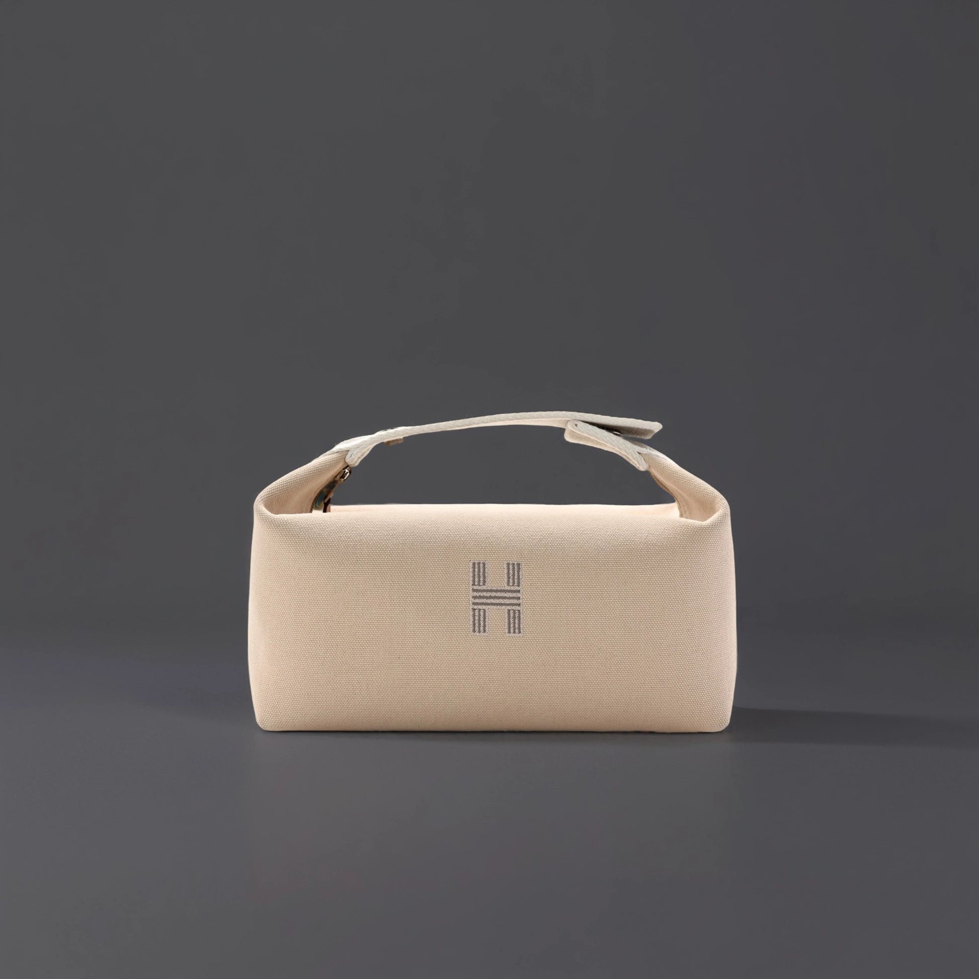 This is an authentic HERMES Canvas Small Bride-A-Brac Pouch in Natural. The pouch is crafted of beige canvas and consists of a snap closure on the top handle, along with a grey stripe around the bag. The top zipper opens to a beige fabric interior with pockets.