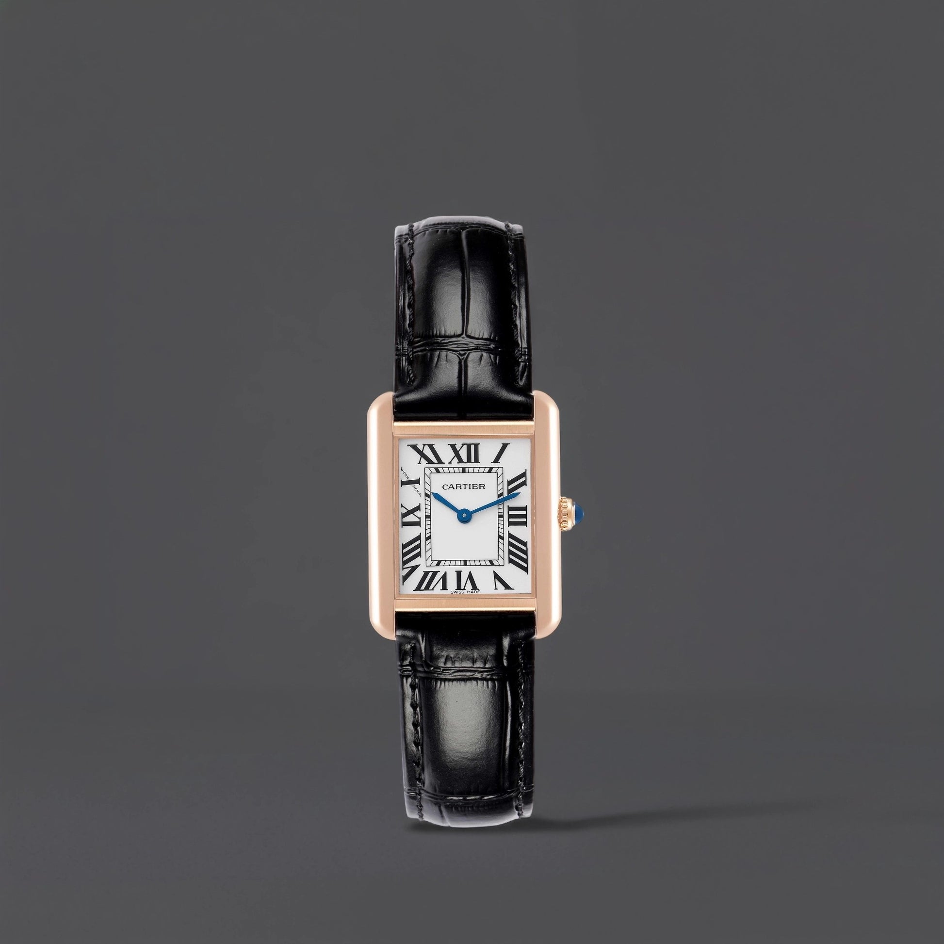Cartier Tank Solo Rose Gold Steel Ladies Watch. Quartz movement. 18k rose gold rectangular case 30.0 x 24.4 mm. Stainless steel case back. Circular grained crown set with blue spinel cabochon. . Scratch resistant sapphire crystal. Silver grained dial with black radial Roman numeral hour markers and an inner minute track. Blued steel sword-shaped hands. Secret Cartier signature at X. Black leather strap with an 18k rose gold tang buckle.