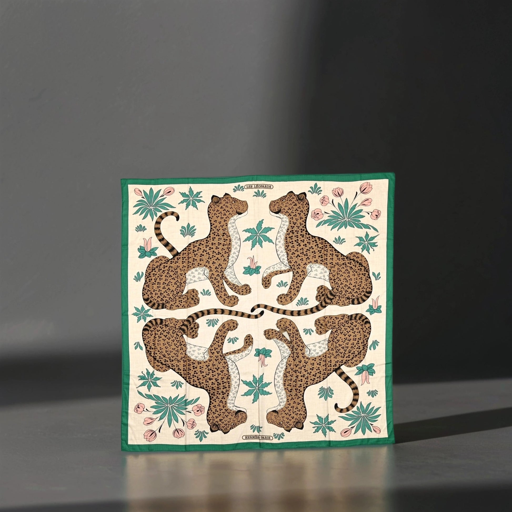 This is an authentic HERMES Cashmere Silk Les Leopards Shawl 140 in Naturel, Vert and Havana. This shawl is crafted of 70% cashmere an 30% silk and features a leopard design on a beige background and green border.