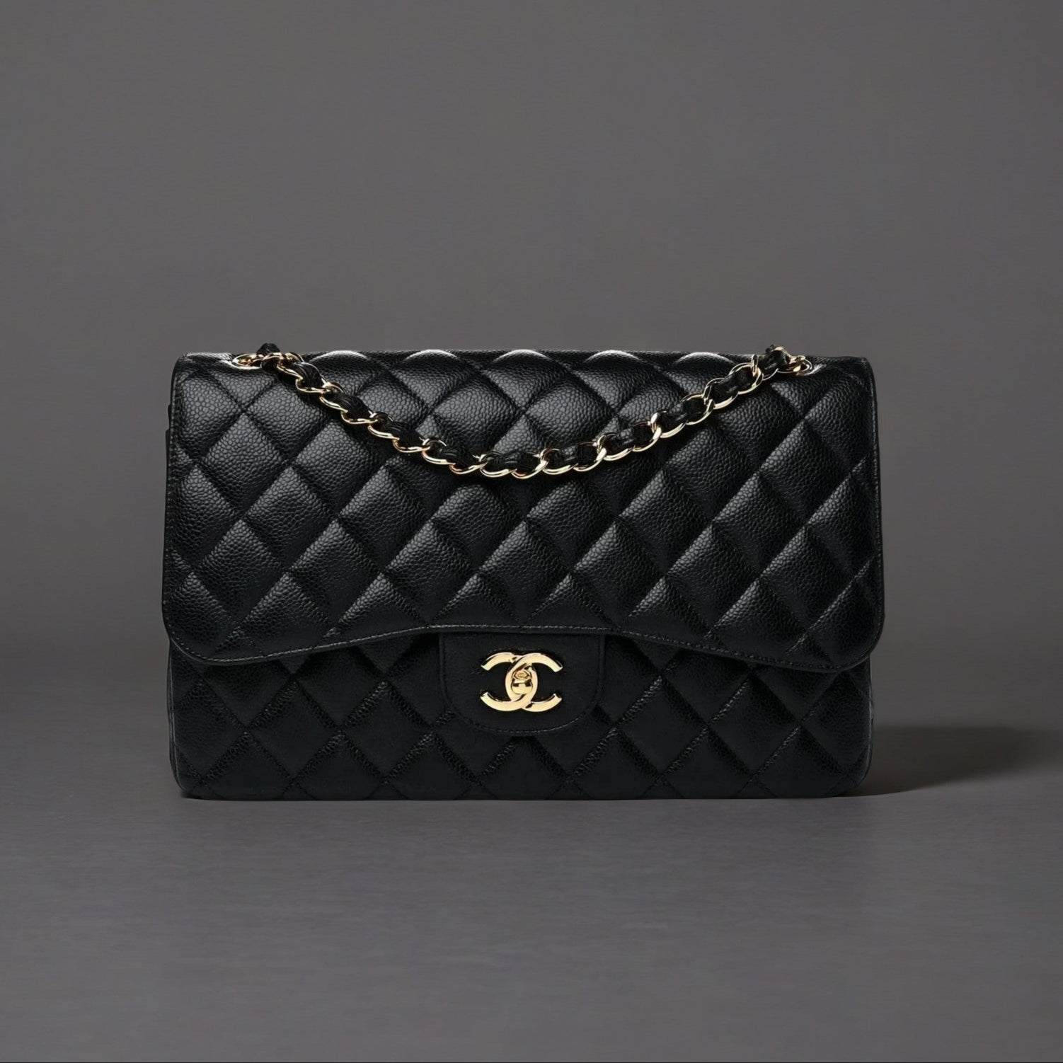 This is an authentic CHANEL Caviar Quilted Jumbo Double Flap in Black. This stylish shoulder bag is crafted of luxurious caviar textured leather. It features leather threaded polished gold chain link shoulder straps, a rear patch pocket, and a front flap with a gold CC turn lock. The flap opens to a second flap and a bordeaux leather interior with patch pockets.