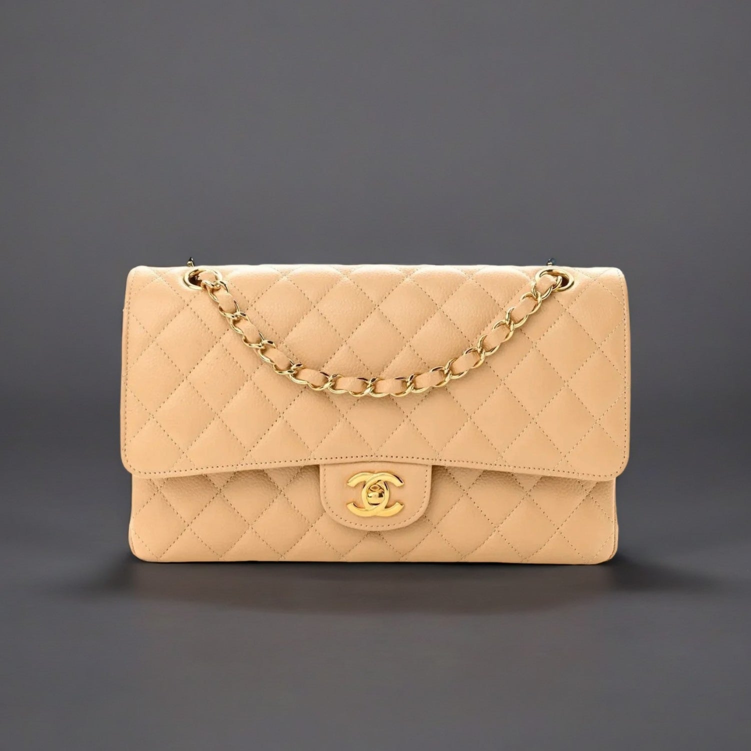 This is an authentic CHANEL Caviar Quilted Medium Double Flap in Beige. This shoulder bag is crafted of caviar leather in beige. It features polished gold chain link leather threaded shoulder straps and a Chanel CC interlocking turn lock for the front flap. This opens to an inner flap and a matching leather interior with patch pockets.