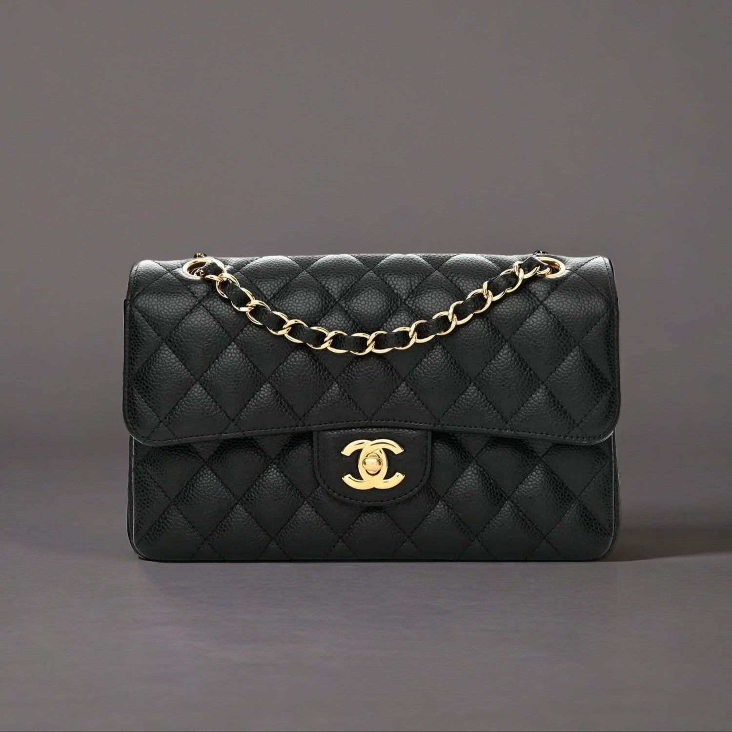This is an authentic CHANEL Caviar Quilted Small Double Flap in Black. This elegant shoulder bag is crafted of luxurious caviar textured leather in black. The bag features a leather-threaded gold chain-link shoulder strap, a rear patch pocket, and a crossover flap with a gold classic CC turn lock. The flap opens to reveal an inner flap and a burgundy leather interior with pockets.