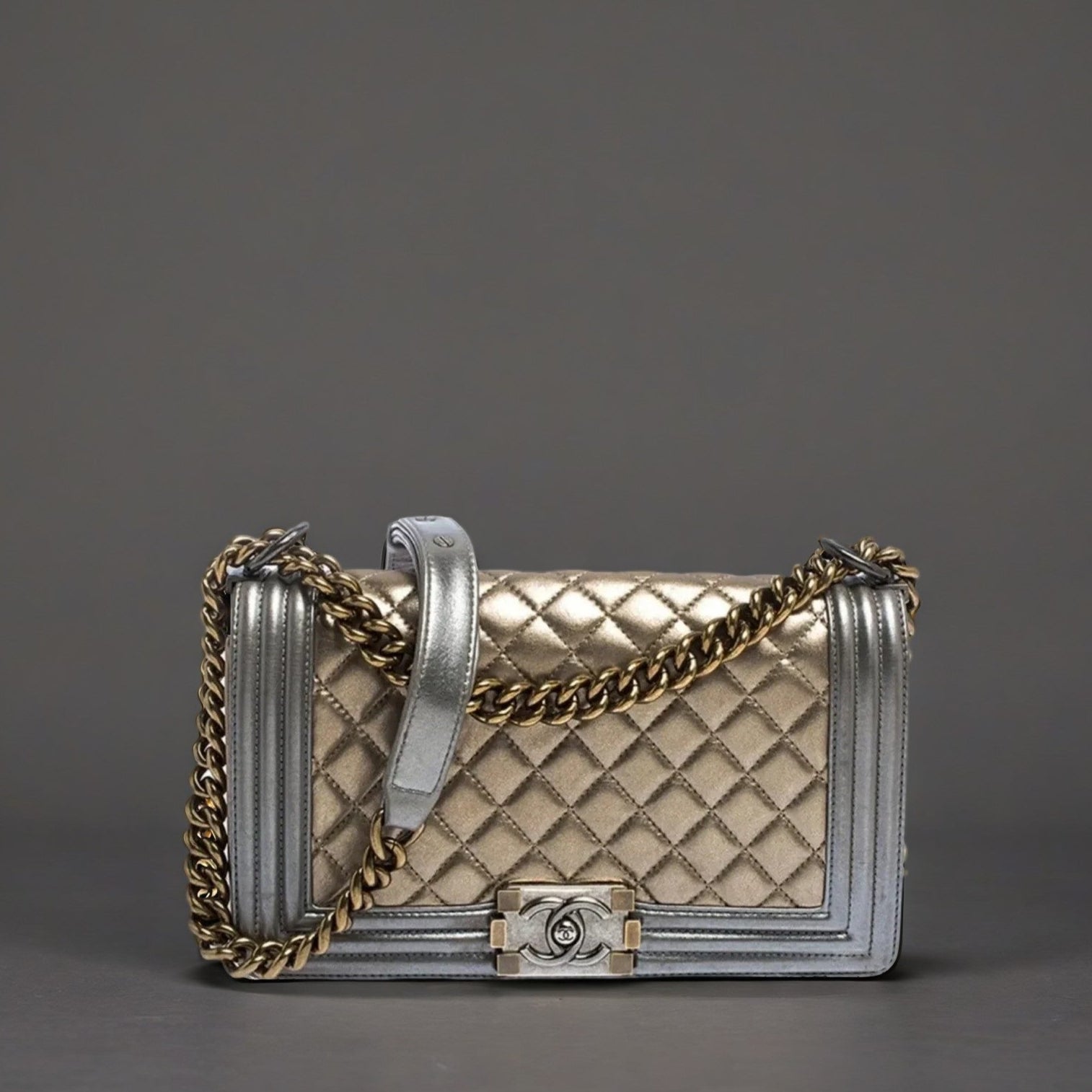Chanel Gold/Grey Quilted Leather Medium Boy Flap Bag