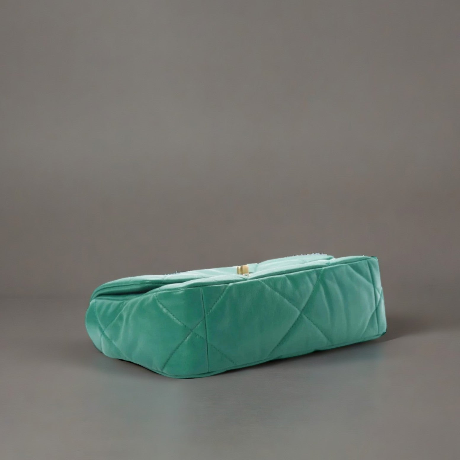 This is an authentic CHANEL Lambskin Quilted Medium Chanel 19 Flap in Green. This pillowy soft shoulder bag is crafted of oversized quilted goatskin leather in a teal green. The refined bag features a chain detail CC turn lock on the flap, a magnetic snap pocket at the rear, and a leather threaded aged gold, ruthenium, and dark silver chain link shoulder strap with a leather shoulder pad. The front flap opens to a matching fabric interior with a zipper pocket. This versatile bag with soft leather is an essential bag for any Chanel aficionado.