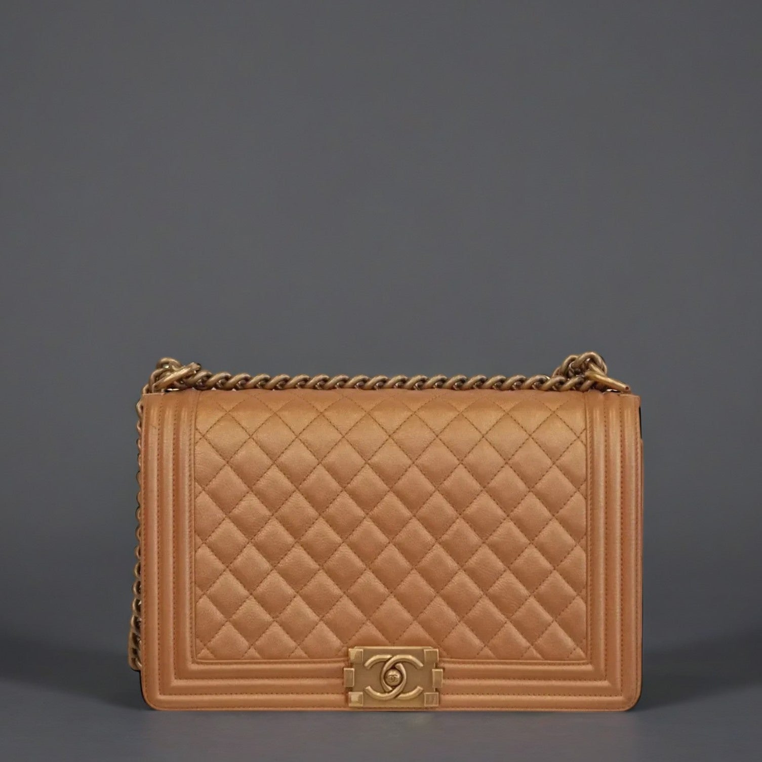 CHANEL Caviar Quilted Boy Flap Light Brown . This stylish shoulder bag is crafted of luxuriously textured diamond quilted leather framed by a peripheral linear quilting. The bag features an aged gold below-the-waist shoulder strap with a leather shoulder pad, and an aged gold Chanel CC press lock for the facing flap. This opens to a matching fabric interior with a patch pocket, ideal for day or evening wear, from Chanel.
