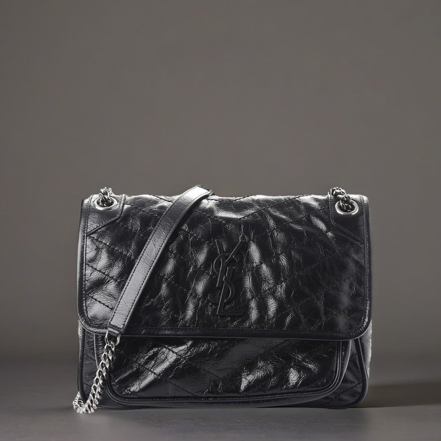 We guarantee this is an authentic SAINT LAURENT Crinkled Calfskin Matelasse Monogram Medium Niki Chain Satchel Black or 100% of your money back. This elegant shoulder tote features crinkled chevron quilting at both the front and the back, with crinkled leather sides. The bag features a aged ruthenium chain link shoulder strap with a matching leather shoulder pad. The frontal flap features a prominent matte black leather YSL monogram detail and opens to a partitioned fabric interior with a zippered and patched pocket. This is an ideal bag for your collection for day or evening, with the classic chic only from Yves Saint Laurent.