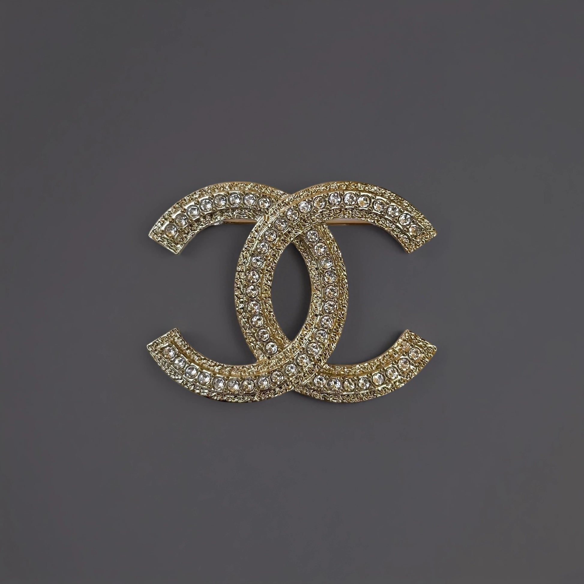 This is an authentic CHANEL Crystal CC Brooch in Gold. This elegant brooch features a gold Chanel CC logo lined with crystals.