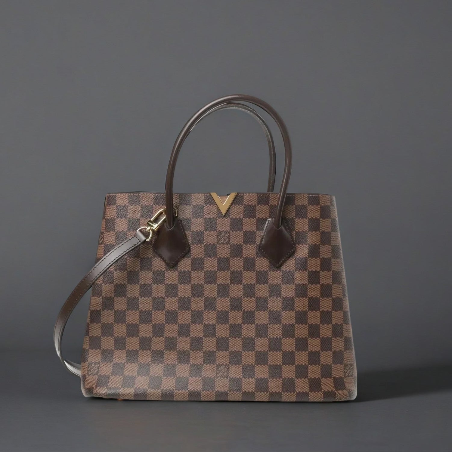 This is an authentic LOUIS VUITTON Damier Ebene Kensington. This tote is crafted of signature damier toile checkered canvas. This shoulder bag features rolled mocha leather handles, an optional shoulder strap and a polished brass cut out V at the top center. The top opens to a partitioned microfiber beige interior with a central zipper compartment.