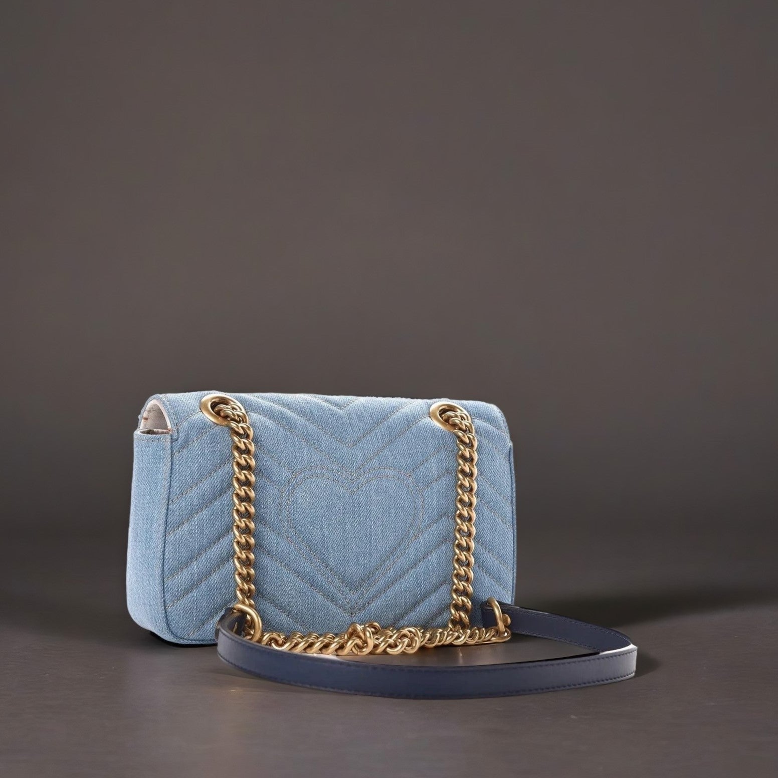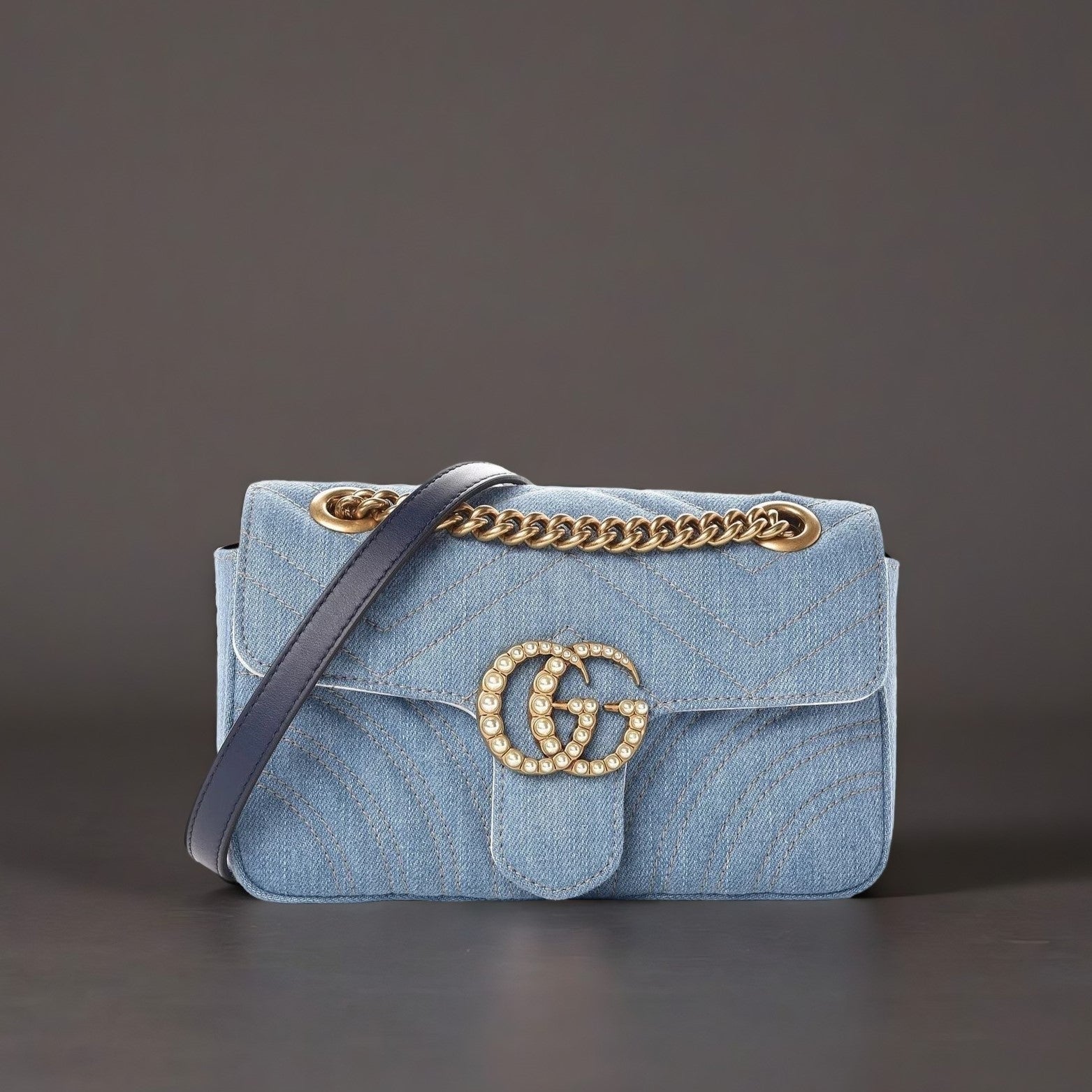 This is an authentic GUCCI Denim Matelasse Pearl Studded Mini GG Marmont Chain Shoulder Bag in Blue. This limited edition shoulder bag is crafted of chevron pattern denim. This bag features an aged gold chain with a blue leather shoulder strap and an interlocking GG logo with faux pearls. The bag opens to a silk floral interior with a flat pocket. This exclusive compact cross body is perfect for anytime of the day, from Gucci!