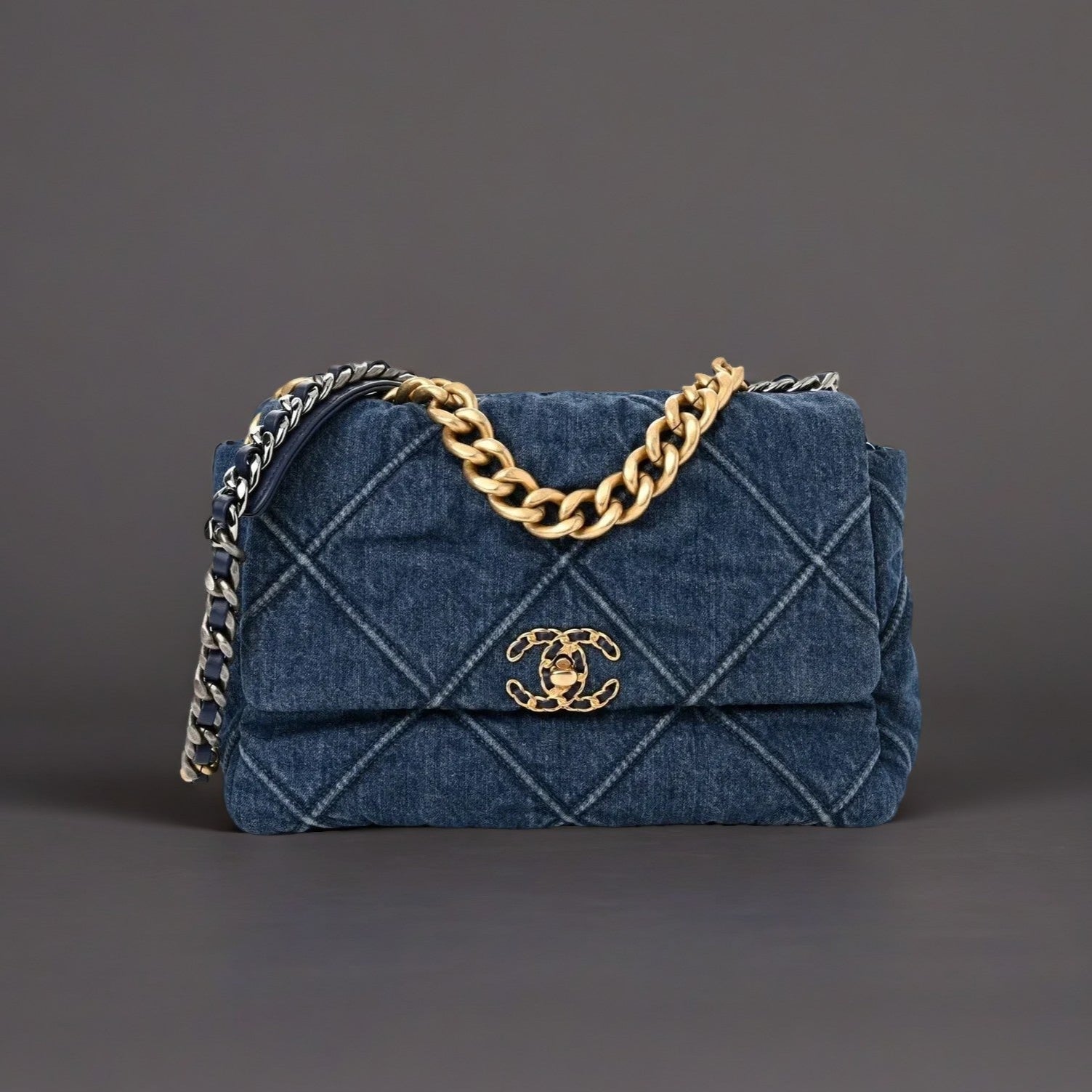 This is an authentic CHANEL Denim Quilted Large Chanel 19 Flap in Blue. This pillowy soft shoulder bag is crafted of oversized quilted denim in blue. The refined bag features a chain detail CC turn-lock on the flap, a magnetic snap pocket at the rear, and a leather threaded aged gold, ruthenium, and dark silver chain-link shoulder strap with a leather shoulder pad. The front flap opens to a blue fabric interior with a zipper pocket.