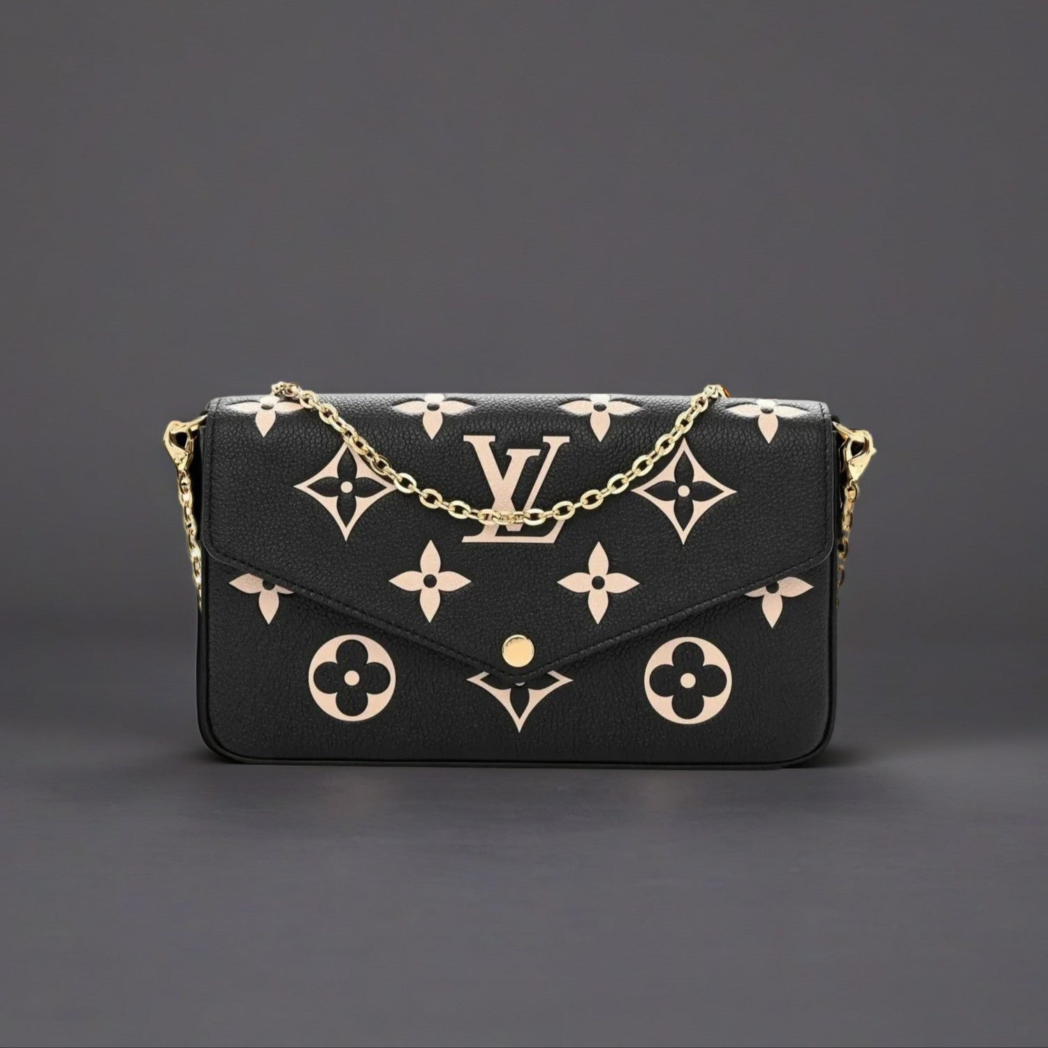 This is an authentic LOUIS VUITTON Empreinte Monogram Giant Felicie Pochette in Black and Beige. This stylish wallet is crafted of Louis Vuitton monogrammed Empreinte leather in black and beige. This wallet features an envelope-style facing flap, an optional gold chain shoulder strap, and gold hardware. The flap opens to a burgundy fabric interior with a patch pocket and 2 inserts.