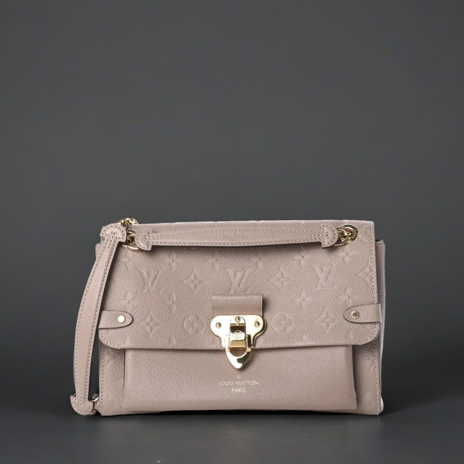 This is an authentic LOUIS VUITTON Empreinte Vavin PM in Vison. This beautiful flap style shoulder bag is crafted of Louis Vuitton monogram embossed leather in beige. The bag features a brass chain-link shoulder strap with leather shoulder pads, a crossover flap, and a polished brass magnetic closure. The flap opens to a matching beige microfiber interior with a zippered compartment and front pocket. This is an excellent shoulder bag, ideal for day or evening use, from Louis Vuitton.