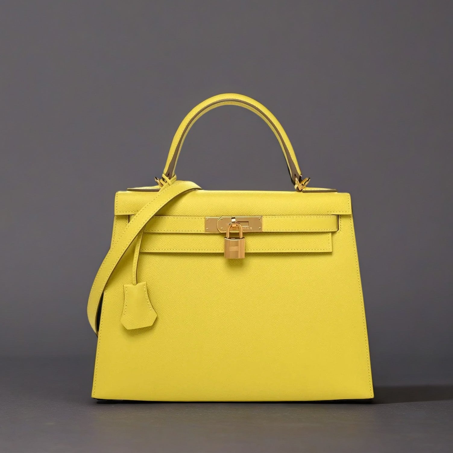 This is an authentic HERMES Epsom Kelly Sellier 28 in Lime. This classic handbag is beautifully crafted of stamped epsom calfskin leather in vibrant lime yellow. A single rolled leather top handle is secured with rose gold hardware and an optional leather shoulder strap. The traditional gold Kelly turn lock secures the small flap with a padlock. A hanging leather key clochette accessorizes this handbag. The interior features two flat pockets, as well as a zippered pocket, both in chevre goatskin leather.