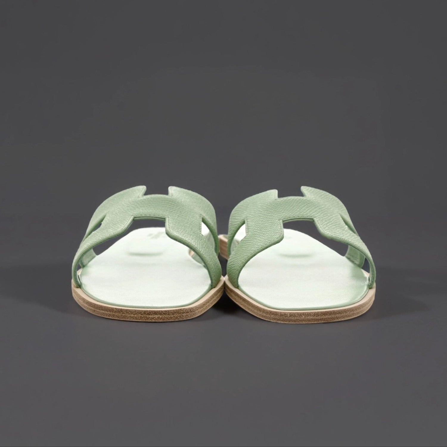 This is an authentic pair of HERMES Epsom Oran Sandals size 37 in Vert Jade. These stylish slippers are crafted of epsom calfskin leather in light green. They feature a toe strap of a cross over large Hermes H.