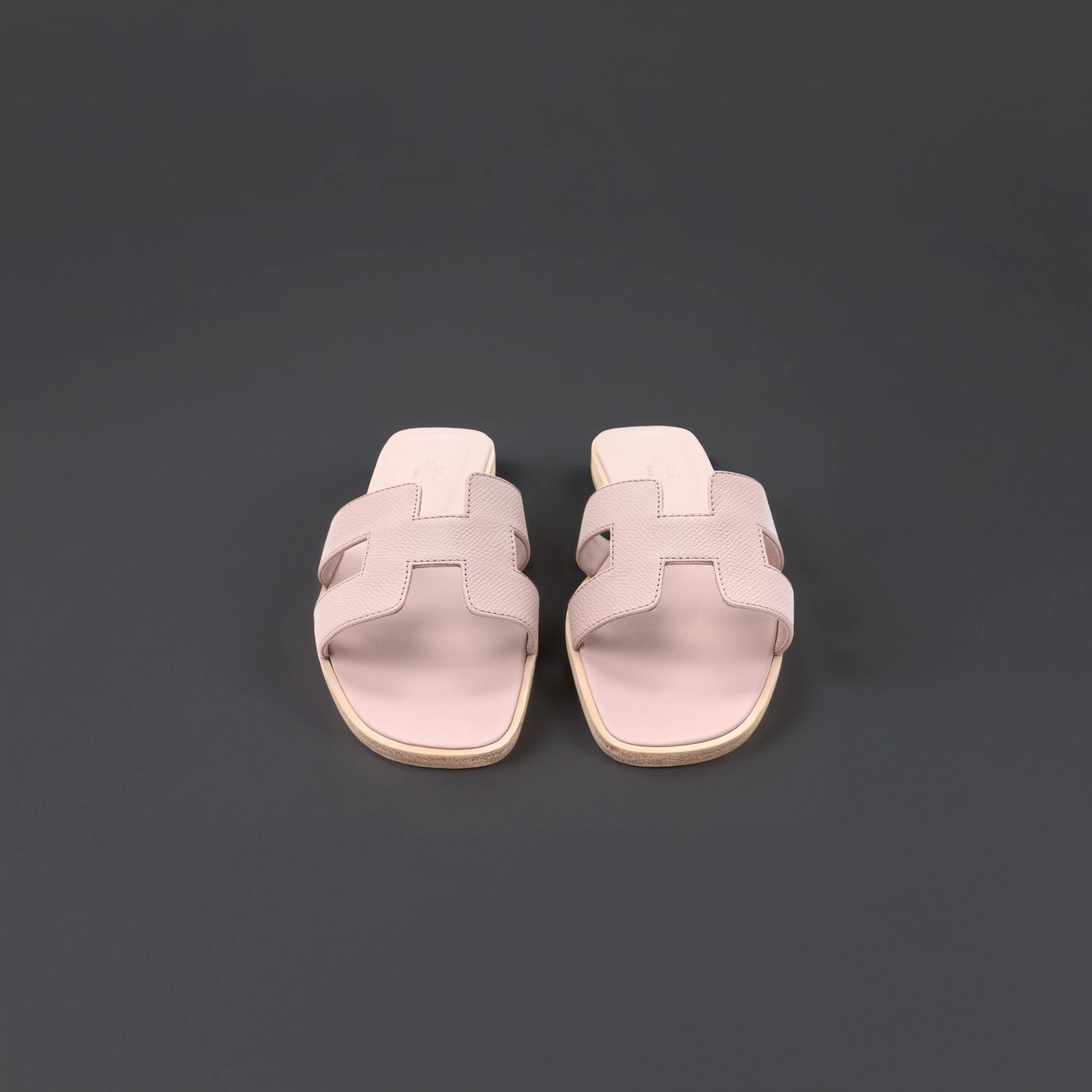 This is an authentic pair of HERMES Epsom Oran Sandals size 40 in Rose Porcelaine. These stylish slippers are crafted of epsom calfskin leather in pink. They feature a toe strap of a cross over large Hermes H.