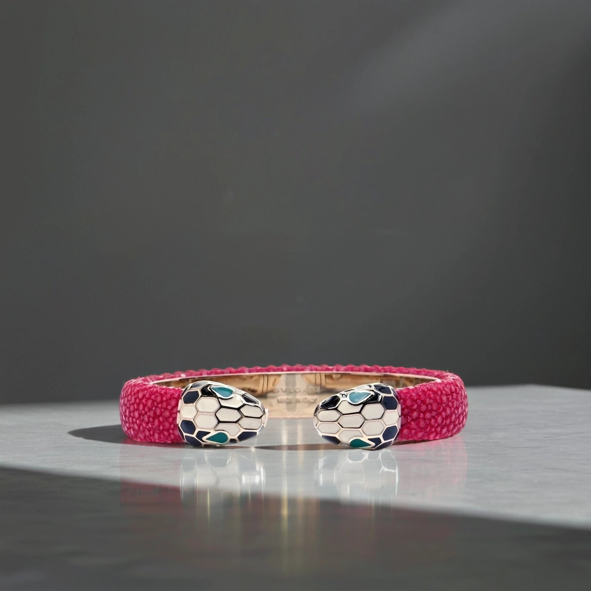 This is an authentic BULGARI Galuchat Serpenti Forever Bracelet in Pink. This stingray cuff features contraire brass light gold plated white and black enamel Serpenti head motifs with malachite enamel eyes.
