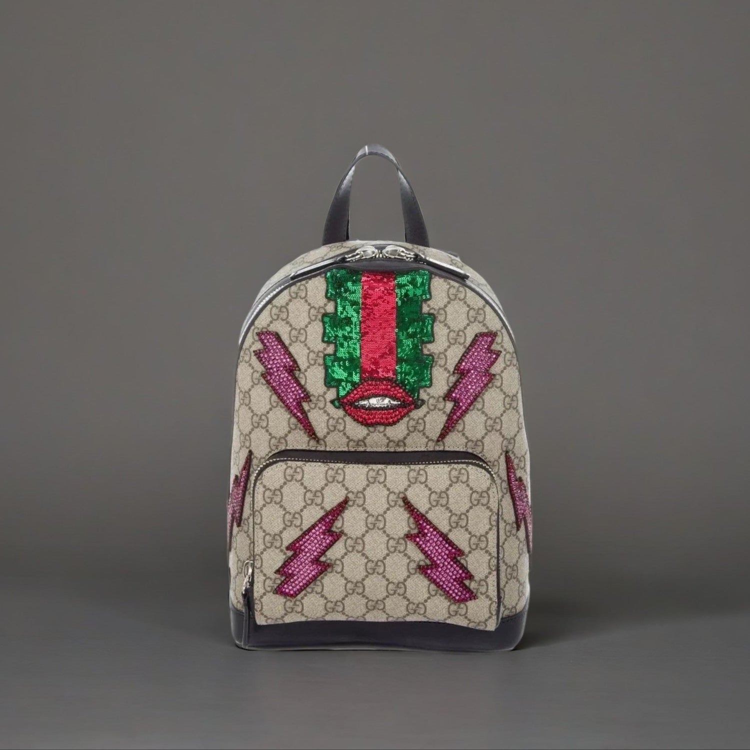This is an authentic GUCCI GG Supreme Monogram Embroidered Small Backpack in Black. This stylish limited edition backpack is crafted of Gucci GG monogram coated canvas featuring decorative patches of thunders and lips . The bag features an external pocket, adjustable nylon shoulder straps, polished silver hardware, and black leather trim. The top zipper opens to a spacious beige microfiber interior with zipper and patch pockets. This stylish backpack is suitable for school or light travel, with the designer appeal of Gucci.