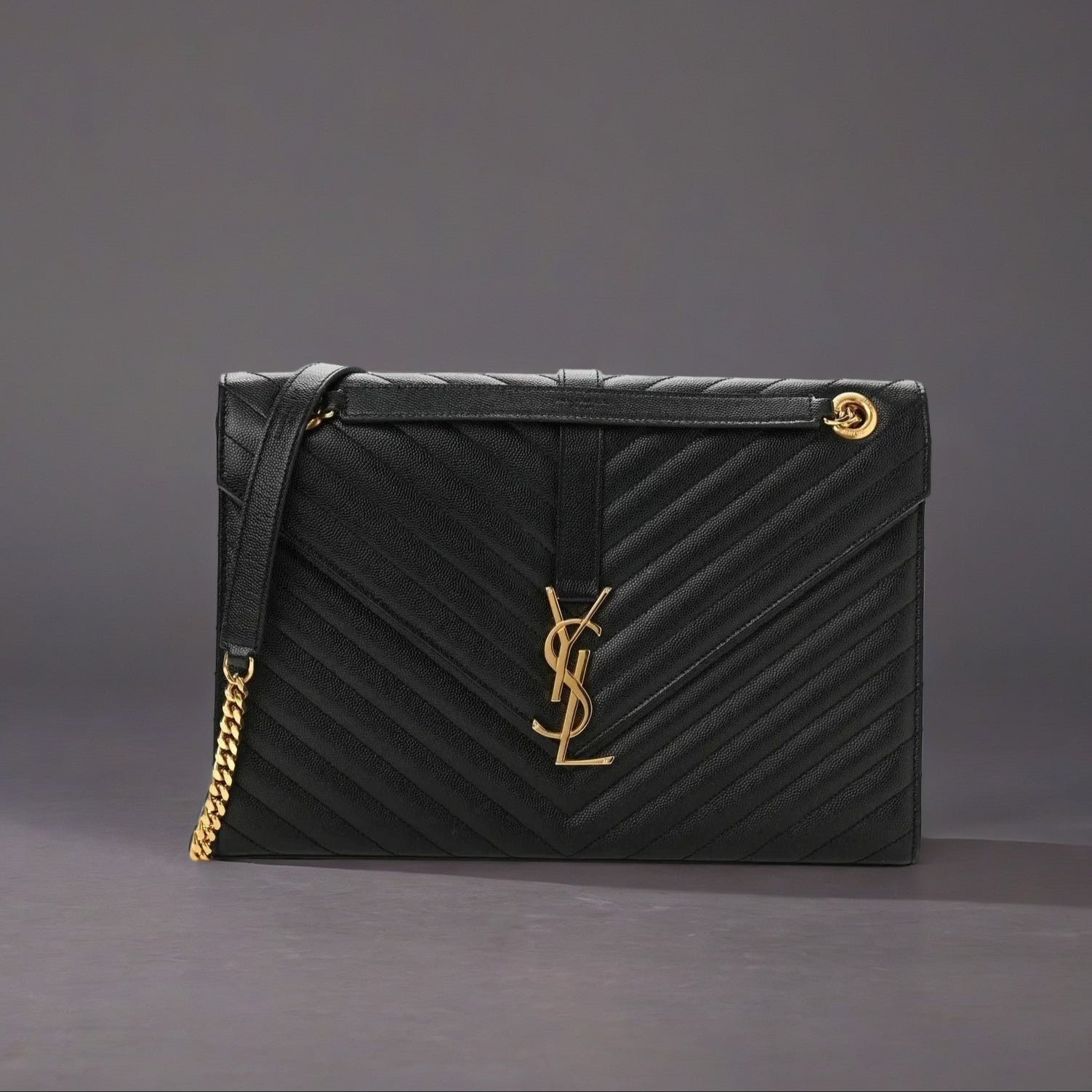 This is an authentic SAINT LAURENT Grain De Poudre Matelasse Chevron Large Monogram Satchel in Black. This elegant shoulder bag is crafted of beautifully pebbled chevron quilted calfskin leather in black. The bag features polished gold hardware, a gold chain link shoulder strap with leather shoulder pads, and a gold YSL emblem on the front flap. The bag opens to a black fabric interior with a zipper pocket.