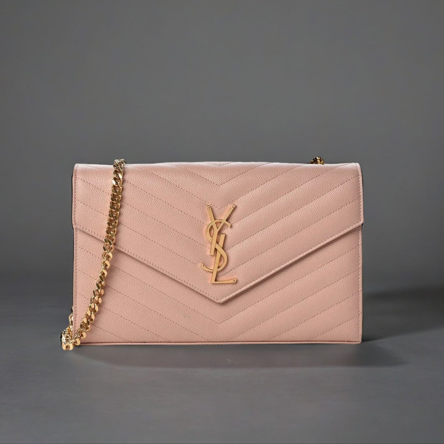 This is an authentic SAINT LAURENT Grain De Poudre Matelasse Chevron Monogram Chain Wallet in Pale Blush. This elegant chain wallet features fine pebbled chevron-quilted leather in pink. This shoulder bag features a polished gold chain-link shoulder strap and a facing V-shaped flap with a prominent gold YSL logo. The flap opens with a gold button snap to a partitioned black and pink leather interior with a central zipper pocket, card slot panels, and patch pockets. This bag has room for daytime or evening essentials with the classic chic of Saint Laurent.
