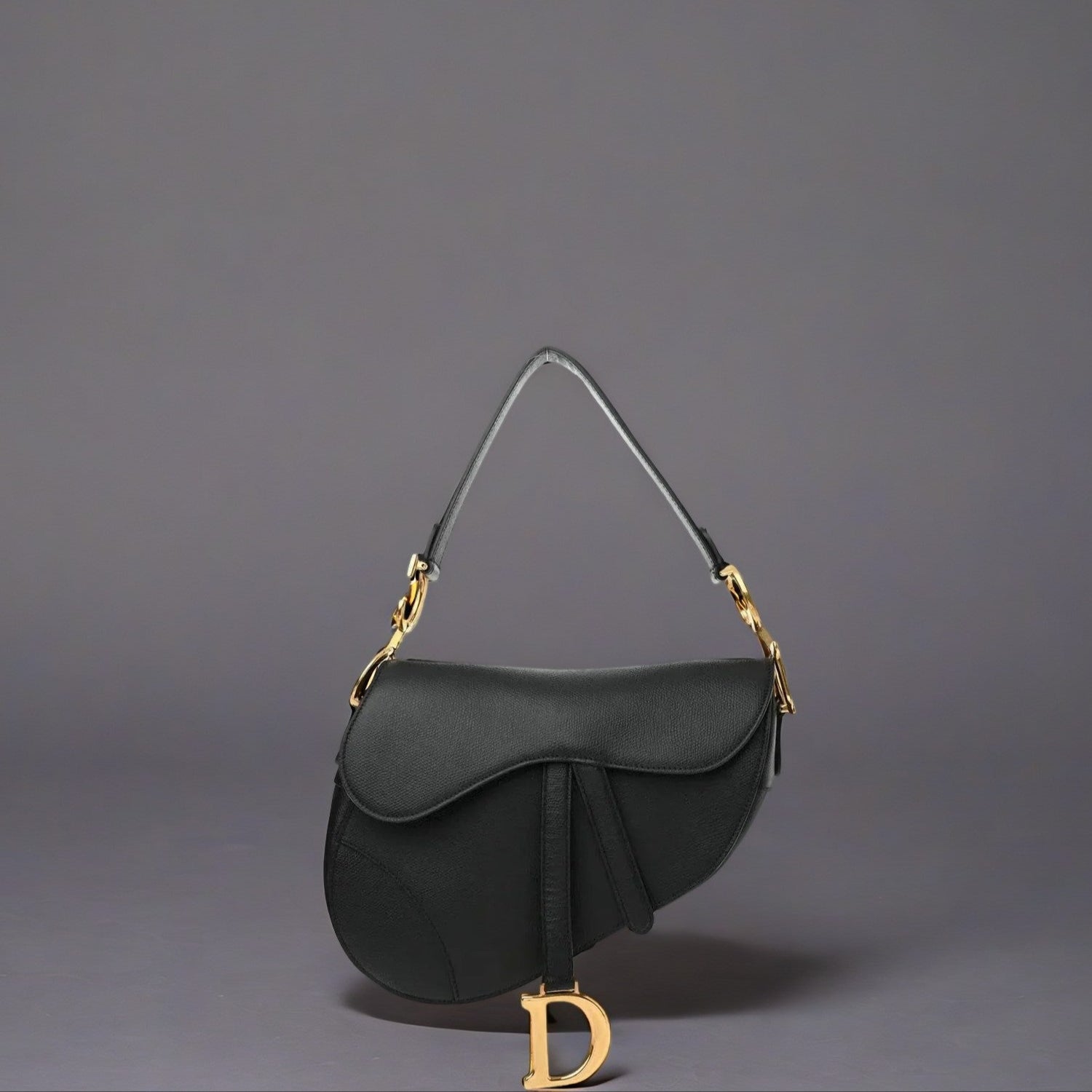 This is an authentic CHRISTIAN DIOR Grained Calfskin Saddle Bag in Black. This chic bag is crafted of grained calfskin leather in black. This bag features the saddle bag shape, short leather shoulder strap with a polished brass "C" and "D" anchors on either end of the handle for handle and a prominent hanging Dior "D" charm. The interior of the bag is a black microfiber textile with a zipper pocket. With extra one strap.
