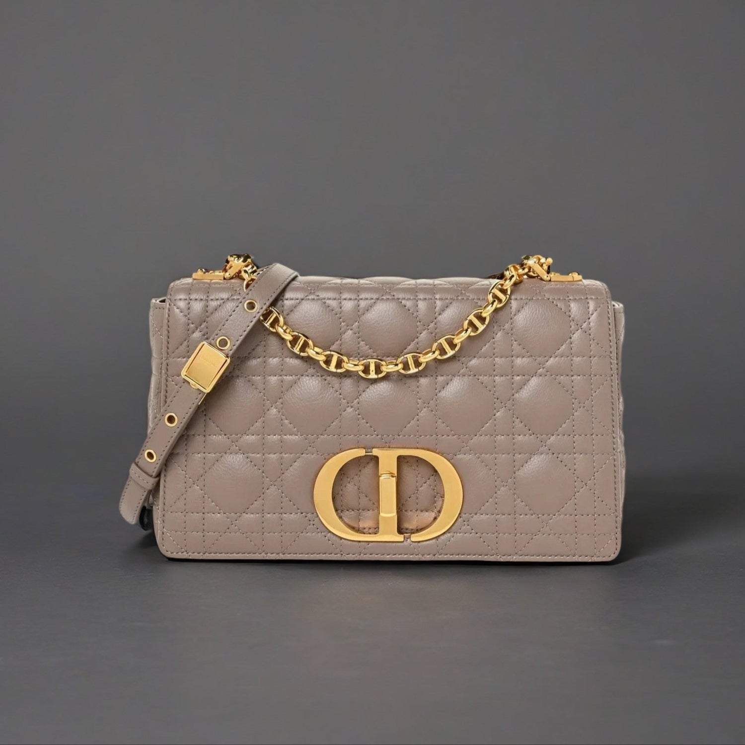 This is an authentic CHRISTIAN DIOR Lambskin Cannage Caro Bag in Warm Taupe. This flap bag is finely crafted in a dark beige solid colored lambskin leather. The bag features an adjustable belt strap and polished gold hardware.