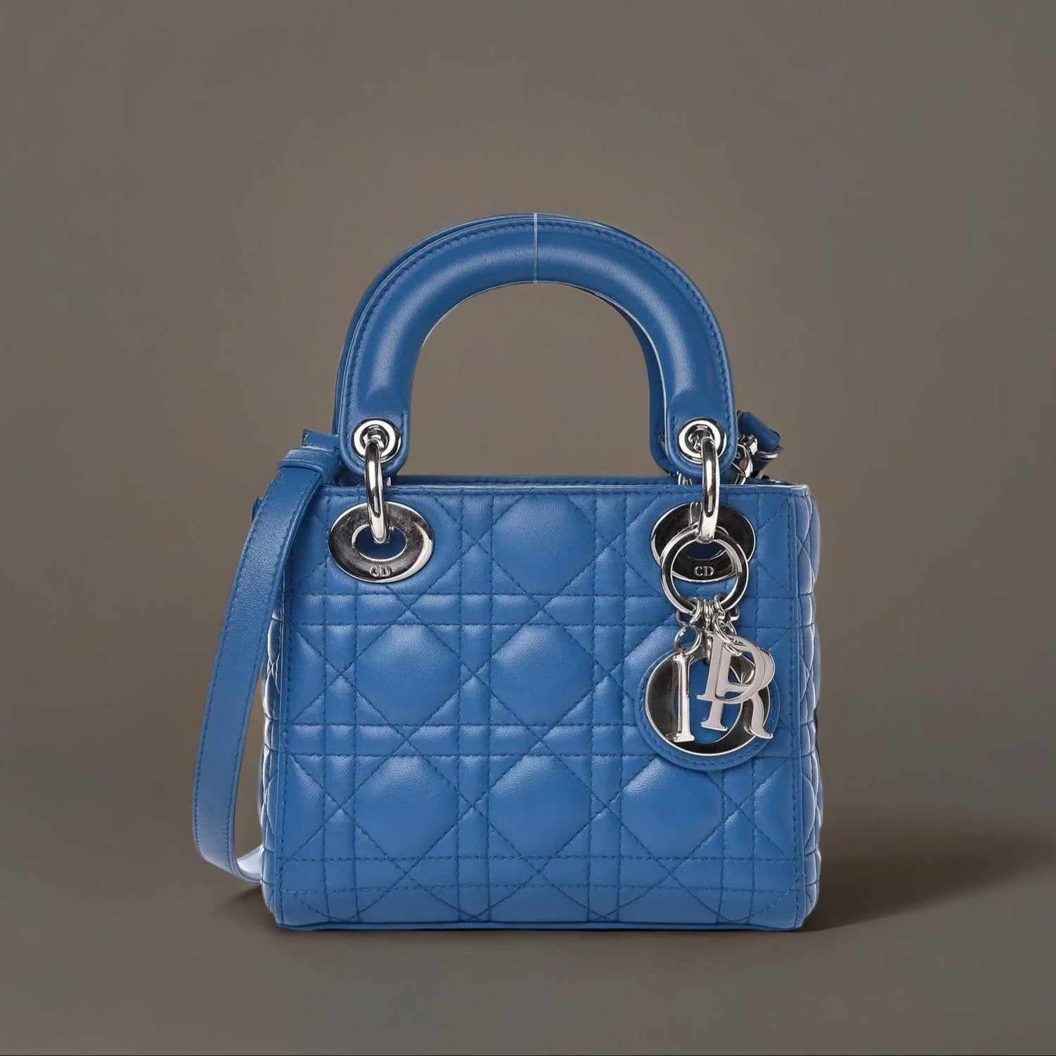 This is an authentic CHRISTIAN DIOR Lambskin Cannage Mini Lady Dior in Blue. This small hand bag is crafted of bright blue leather with a geometric quilted pattern. It features rolled leather handles, an optional shoulder strap, and silver hardware including handle rings, clasps, decorative eyelets, and a hanging “Dior" letters charm. The top is secured by an interior flap and opens to a beige Dior logo jacquard weave fabric with a zipper pocket. This is an ideal everyday bag with the right touch of classic chic from Dior.