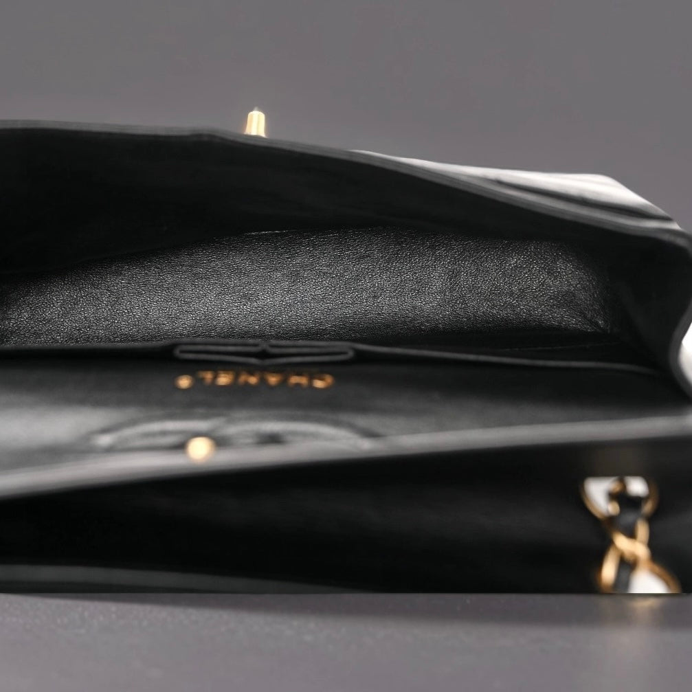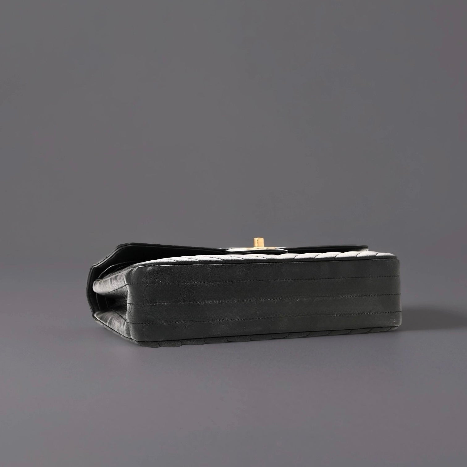 This is an authentic CHANEL Lambskin Chevron Quilted Medium Double Flap in Black. This stylish shoulder bag is crafted in black chevron-quilted lambskin leather. It features a gold chain link leather threaded shoulder strap, a front flap, and a matching gold Chanel CC turn lock. The flap reveals an inner flap and a black leather interior with patch pockets.