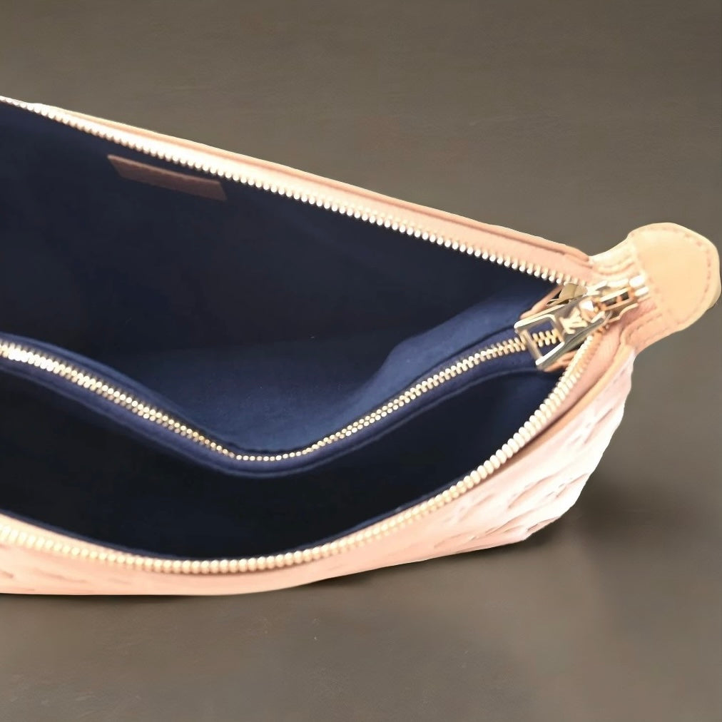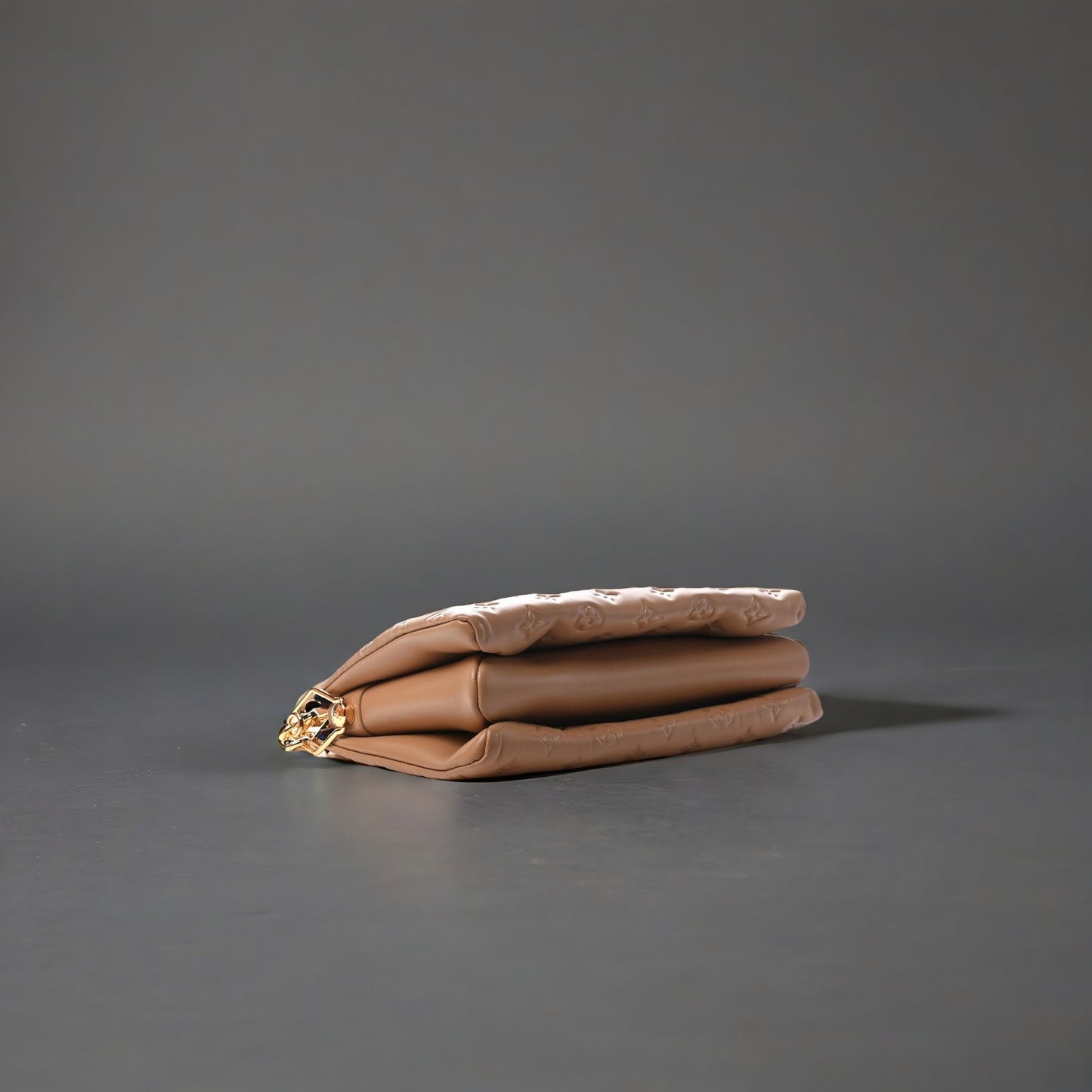 This is an authentic LOUIS VUITTON Lambskin Embossed Monogram Coussin PM in Camel. From Louis Vuitton's Spring 2021 collection, this soft and supple shoulder bag is crafted of monogram-embossed lambskin leather in beige. The bag can be carried solo as a clutch, with the gold hardware Edge Chain strap, or with the adjustable strap for wearing crossbody or on the shoulder. The three zippered compartments are lined in dark blue microfiber.