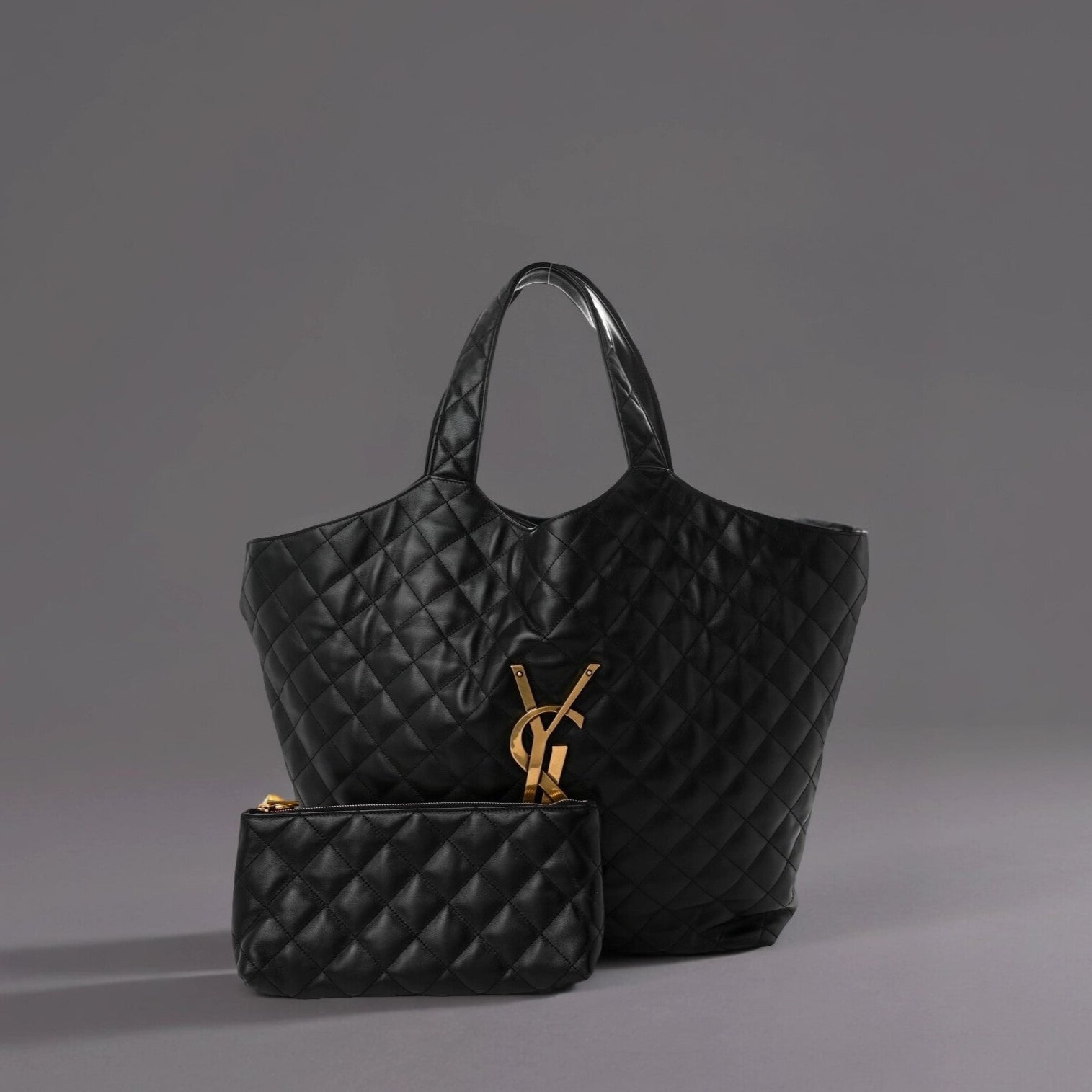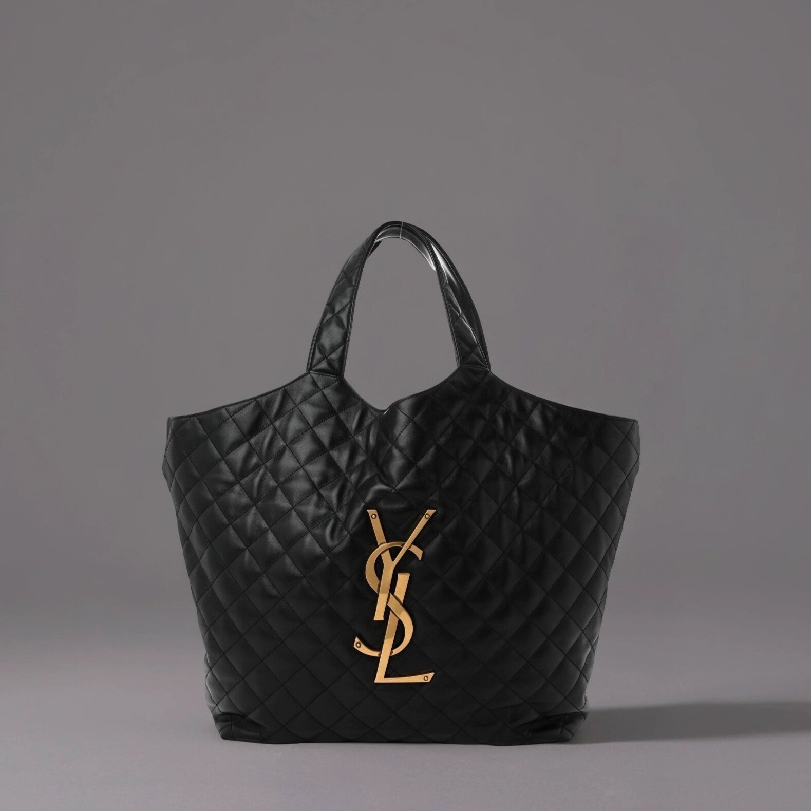 This is an authentic SAINT LAURENT Lambskin Quilted Maxi Icare Shopping Tote in Black. This chic tote is crafted of supple diamond-stitched calfskin leather in black. The bag features leather handles, and a large aged gold YSL emblem on the front. The top opens to a black fabric interior with an aged gold chain link strap to cinch the sides, a matching removable pouch, and a zipper pocket.