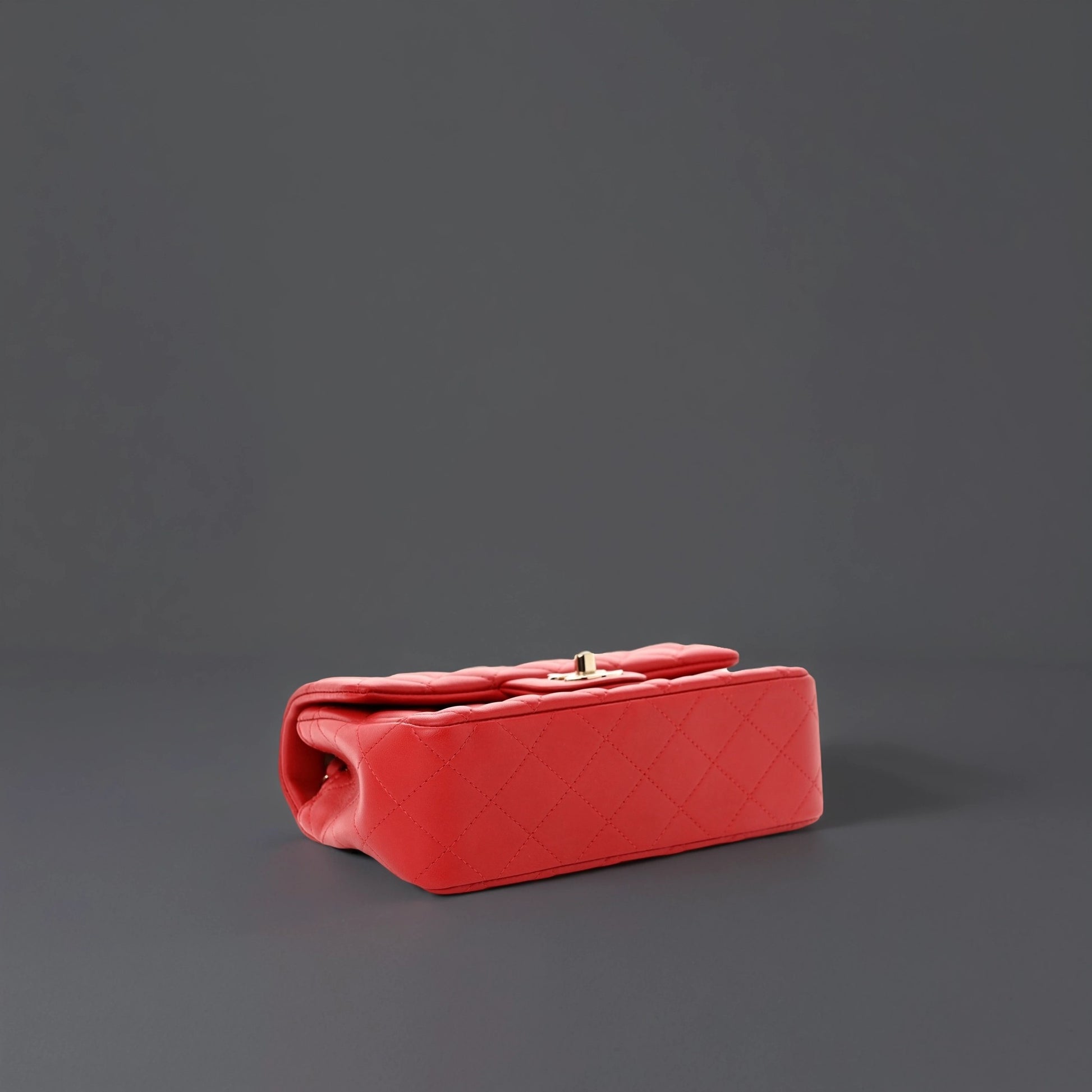 This is an authentic CHANEL Lambskin Quilted Mini Rectangular Flap in Red. This chic mini bag is crafted of quilted lambskin leather in red. The bag features a leather-threaded crossbody chain strap, a rear patch pocket, and a gold-toned CC turn lock on the crossover flap. This opens to a red leather interior with zipper and patch pockets.