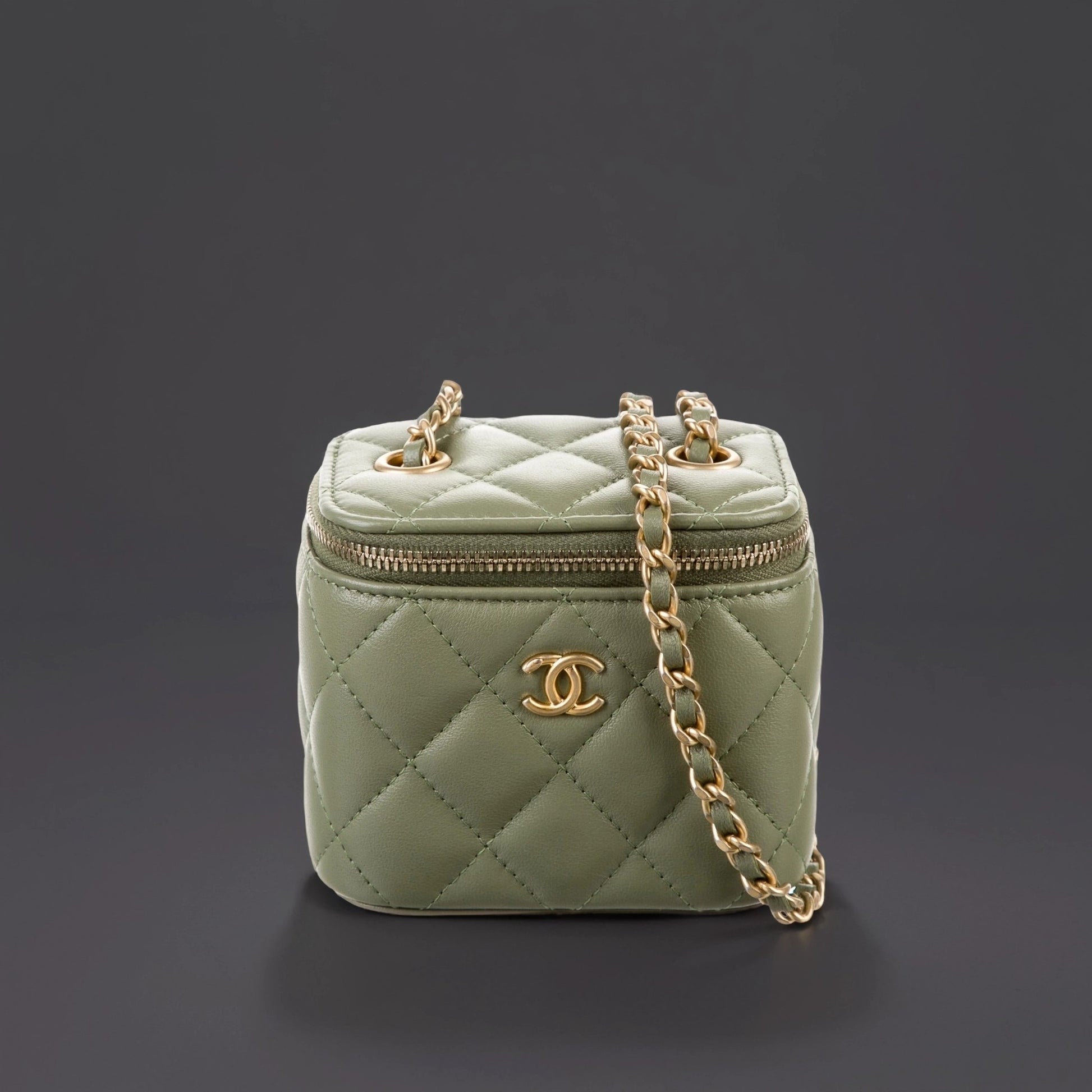 This is an authentic CHANEL Lambskin Quilted Pearl Crush Mini Vanity Case With Chain in Olive Green. This stylish crossbody is crafted of luxurious lambskin in green. The bag features a leather threaded aged gold chain-link shoulder strap and aged gold hardware. The handbag features a 3/4 wrap-around zipper that opens to a light gold fabric interior.