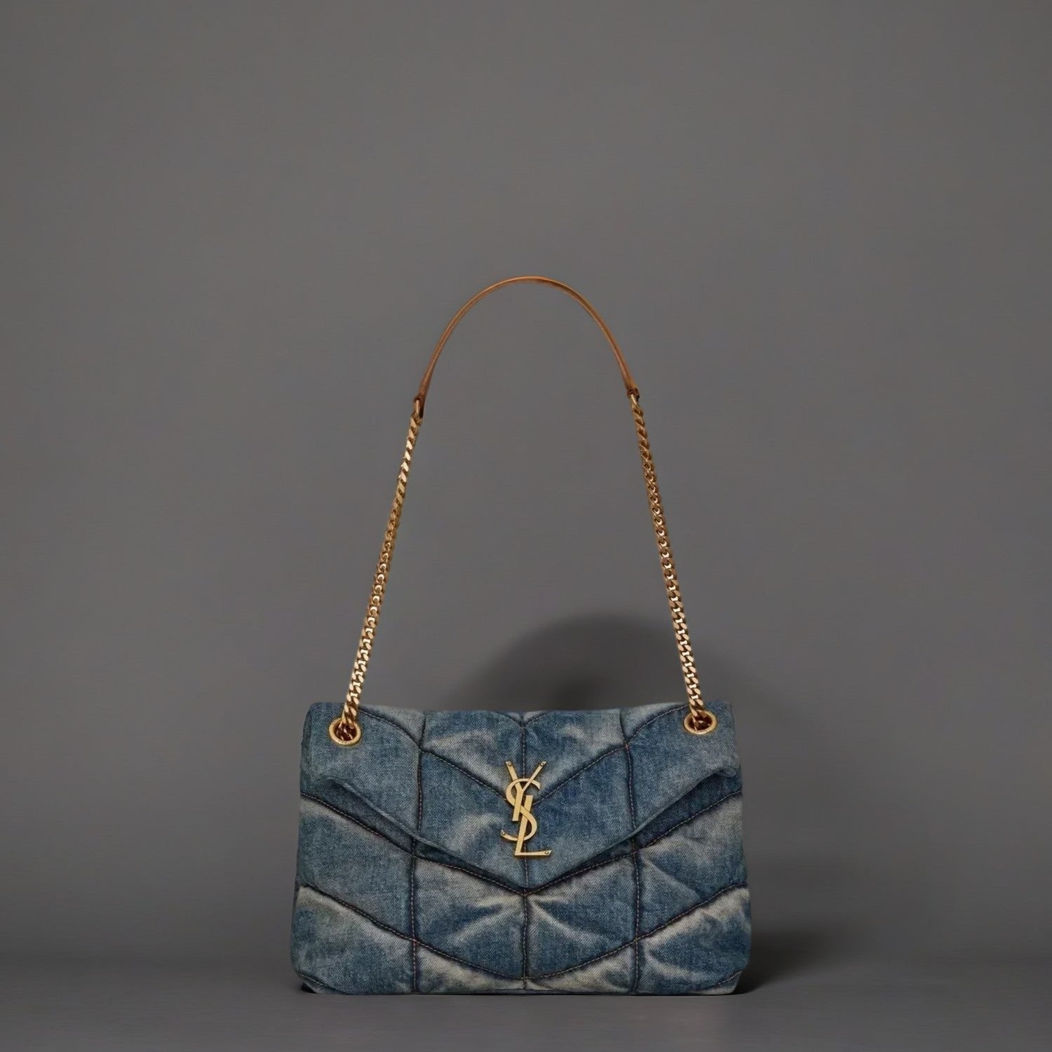 Saint Laurent brings volume to its signature silhouette, the Loulou, giving it a finish that imitates a puffer jacket. Crafted in Italy from quilted blue denim, this small style is finished with gold-tone hardware – including the iconic YSL logo detail on the envelope-style top flap.